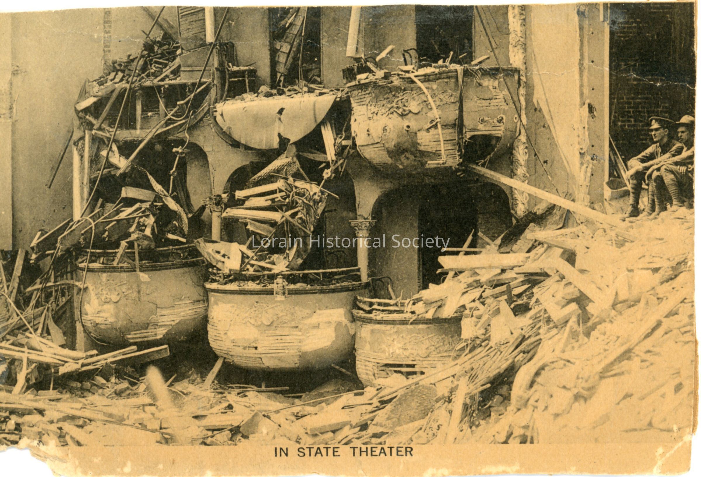 Postcard print is view of balconies in State Theatre showing damage and destruction from 1924 Tornado. Postcard reads: "IN STATE THEATER".Acquisition