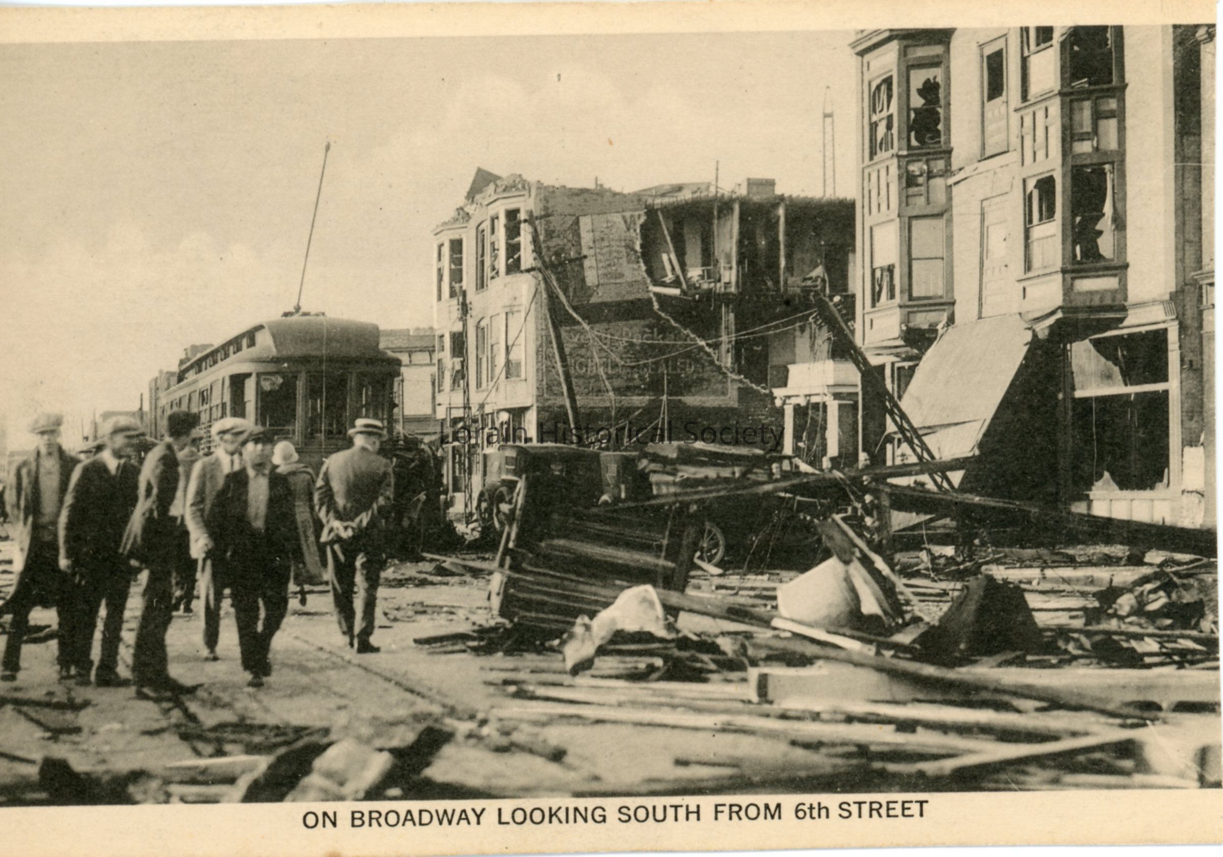 Postcard print is view of West Side Broadway/North Broadway after 1924 Tornado. L to R: 280-282 Broadway, Hotel Black; 276 North Broadway, Canfield Service Station; 272 North Broadway, William Gage Restaurant; 258 North Broadway, Overland Kilgore Co.; William N. Little, Real Estate, Insurance & Bonding, is man in straw hat with hands behind his back. Postcard print reads: "ON BROADWAY LOOKING SOUTH FROM 6th STREET".Acquisition