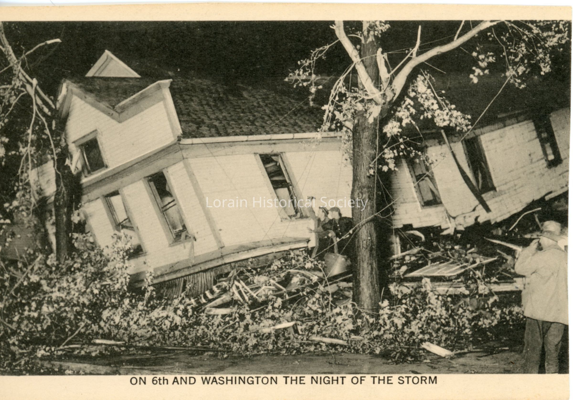 Postcard print is view of West 6th Street and Washington Avenue, showing damage to house on night of 1924 Tornado. Postcard print reads: "ON 6th AND WASHINGTON THE NIGHT OF THE STORM".Acquisition