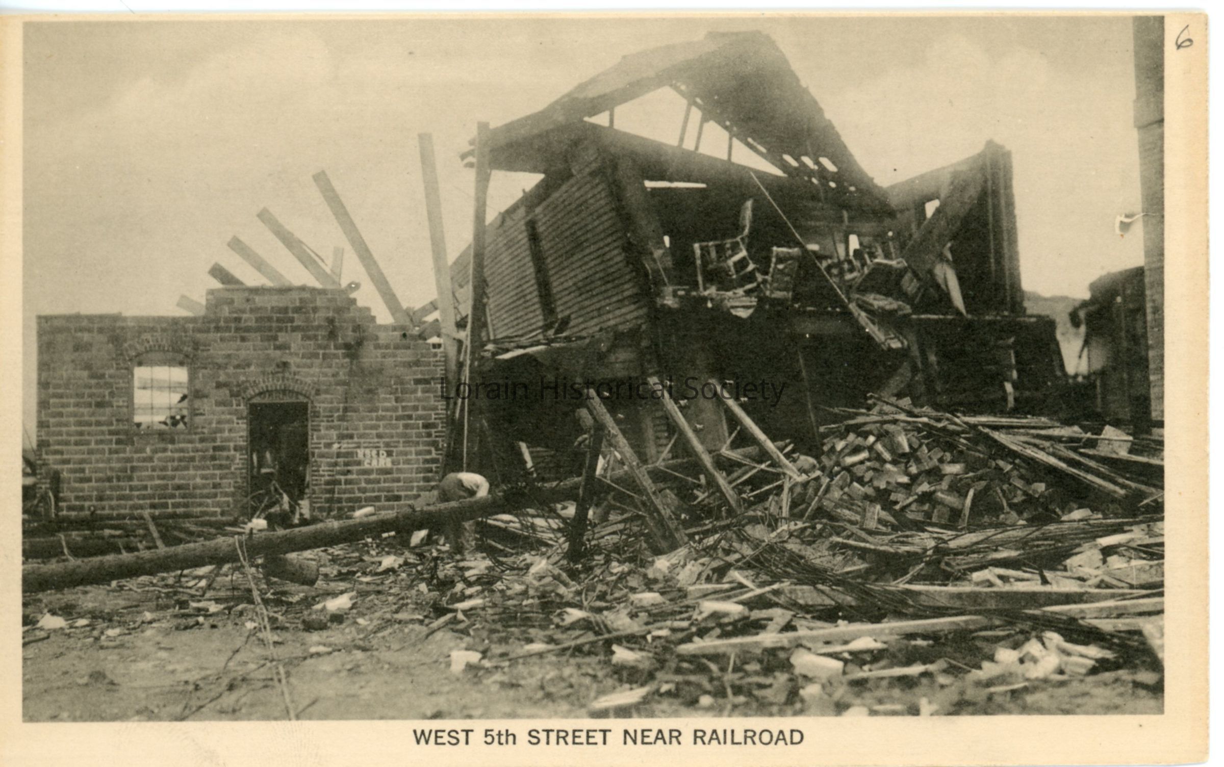 Postcard print is view of houses on West Sixth Street near the railroad destroyed by the 1924 Tornado. Postcard print reads: "WEST 6th STREET NEAR RAILROAD".Acquisition