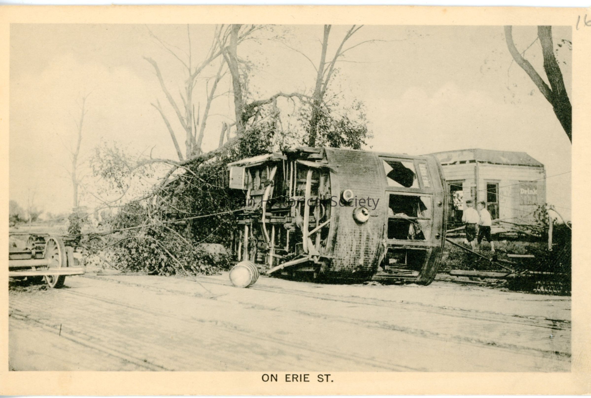 Postcard print is view of streetcar overturned on West Erie Avenue during 1924 Tornado. Postcard print reads: "ON ERIE ST.".Acquisition