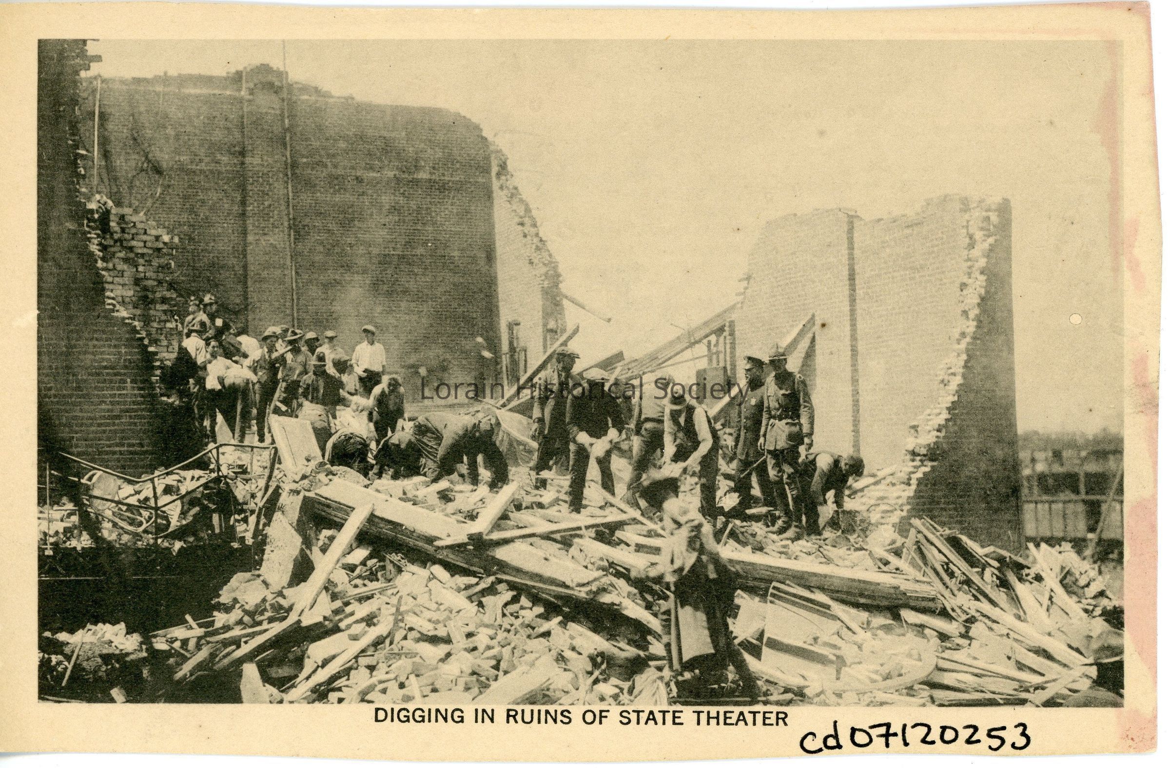 Postcard Print is view of workmen digging in ruins of State Theatre, 375 Broadway, after 1924 Tornado. Postcard reads: "DIGGING IN RUINS OF STATE THEATER".Acquisition