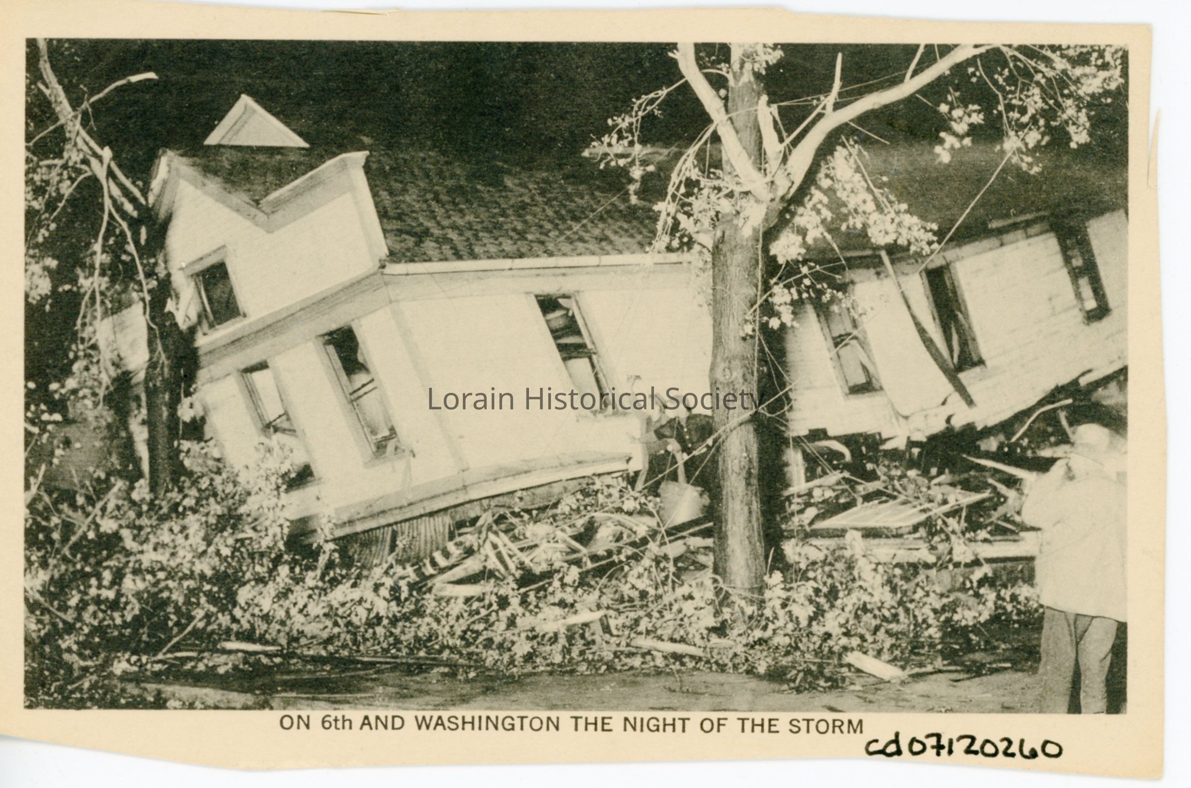 Postcard print is view of West 6th Street and Washington Avenue, showing damage to house on night of 1924 Tornado. Postcard reads: "ON 6th AND WASHINGTON THE NIGHT OF THE STORM".Acquisition