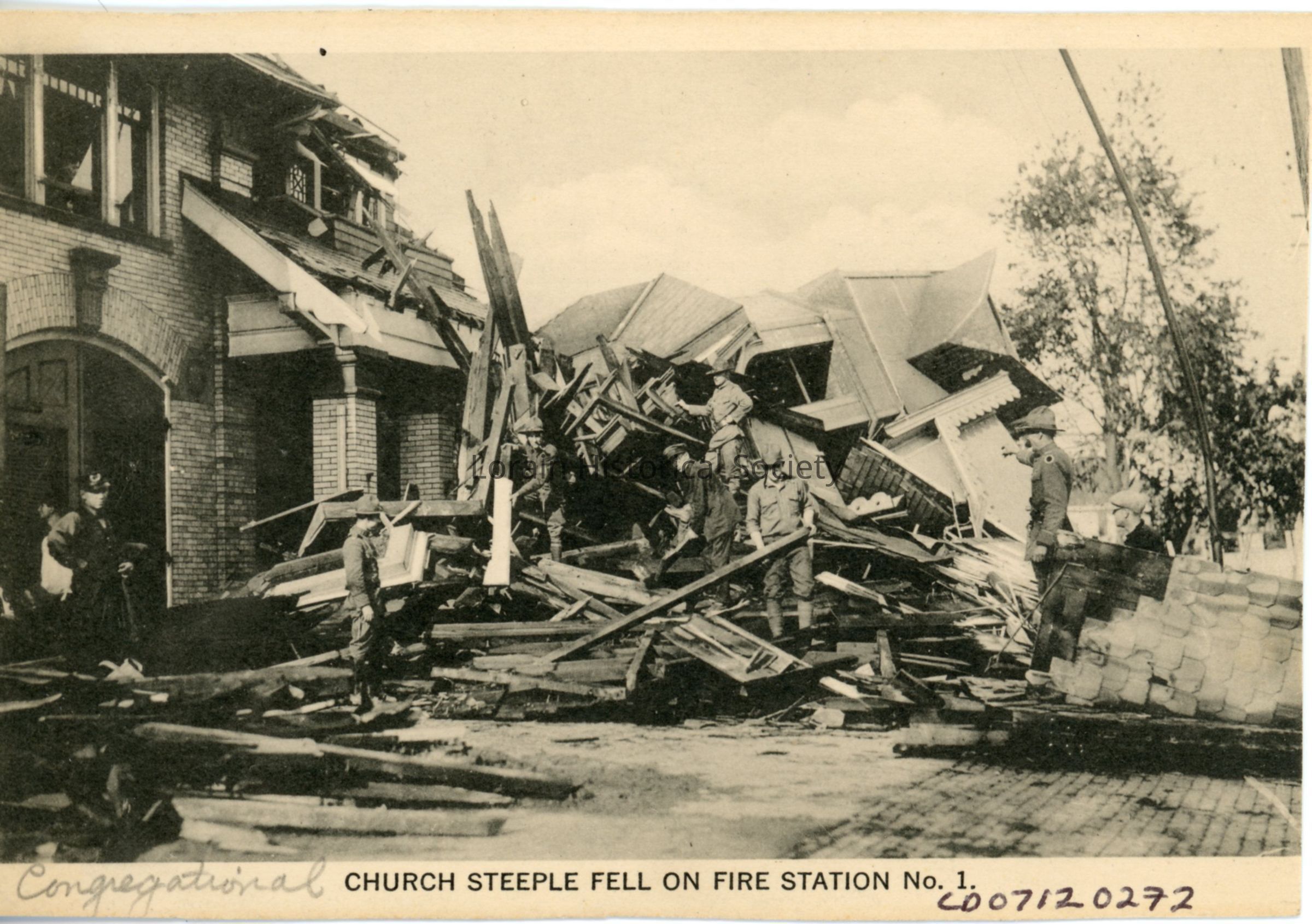 Postcard print is view of First Congregational Church steeple that fell on Fire Station No. 1 during 1924 Tornado, showing damage to church and fire station. Postcard print reads: "CHURCH STEEPLE FELL ON FIRE STATION NO. 1".Acquisition