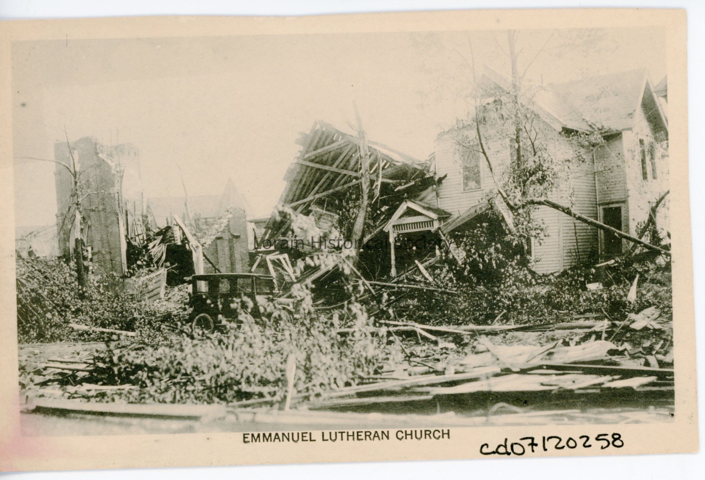 Postcard print is view of Emmanuel Evangelical Church, Northwest corner of West Sixth Street and Reid Avenue, showing damage and destruction from 1924 Tornado. Postcard reads: "EMMANUEL LUTHERAN CHURCH".Acquisition