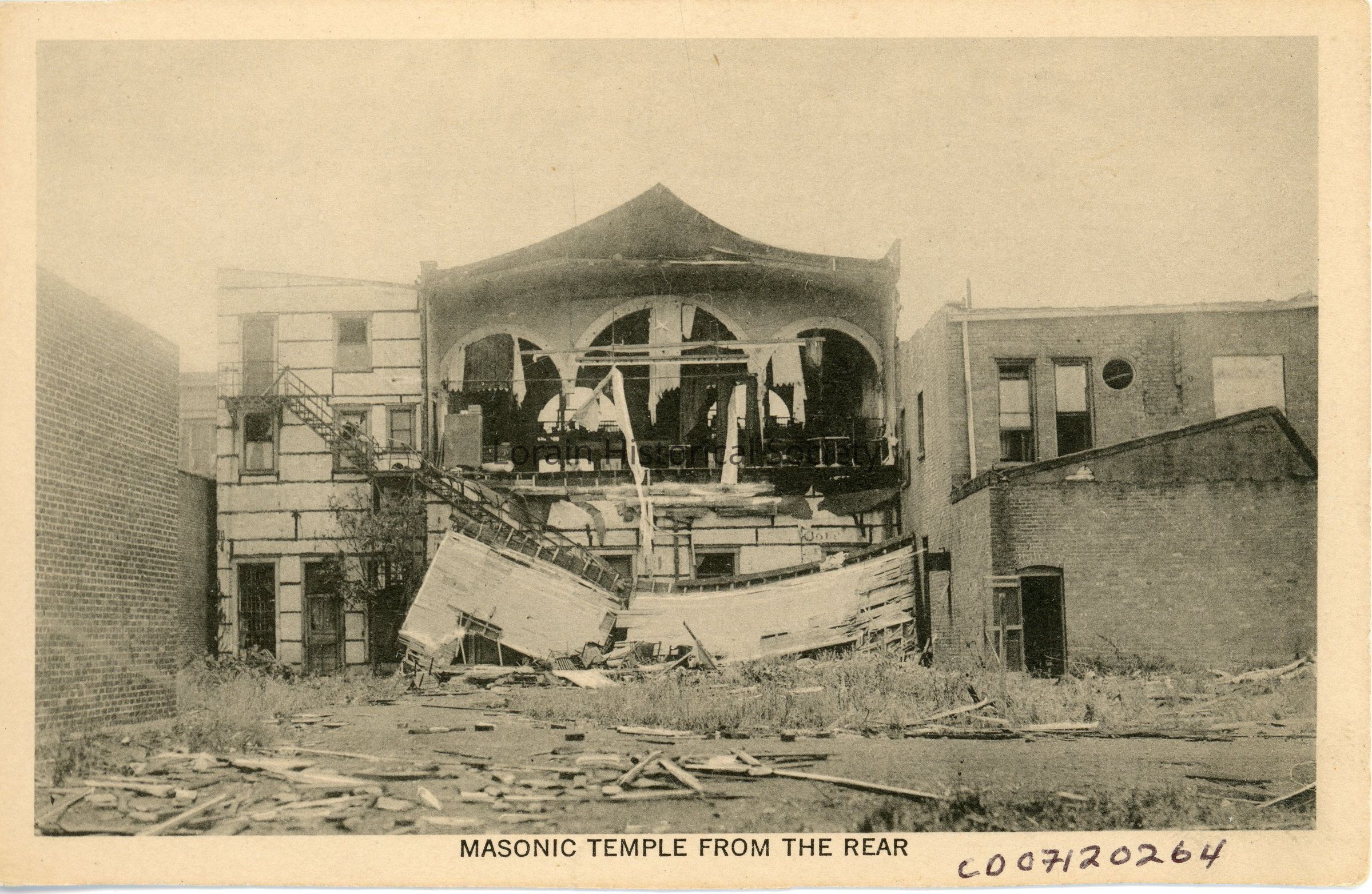 Postcard print is rear view of Masonic Hall, 675 Broadway, showing damage from 1924 Tornado. Postcard print reads: "MASONIC TEMPLE FROM THE REAR".Acquisition