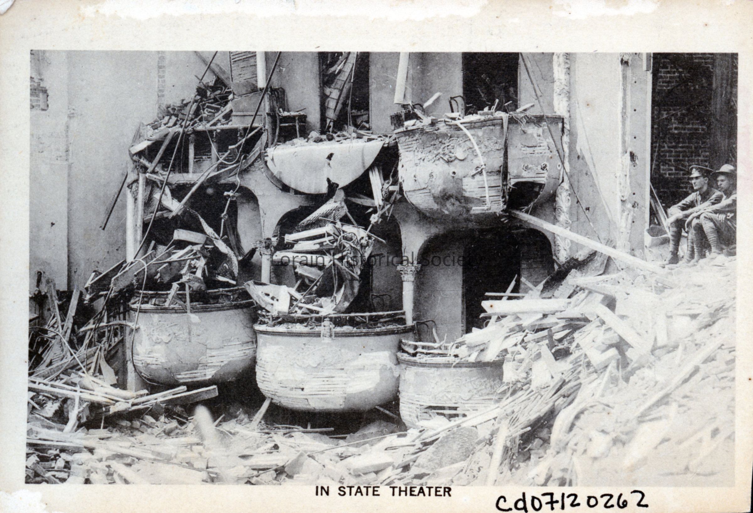 Postcard print is view of balconies in The State Theatre showing damage and destruction from 1924 Tornado. Postcard print reads: "IN STATE THEATER".Acquisition
