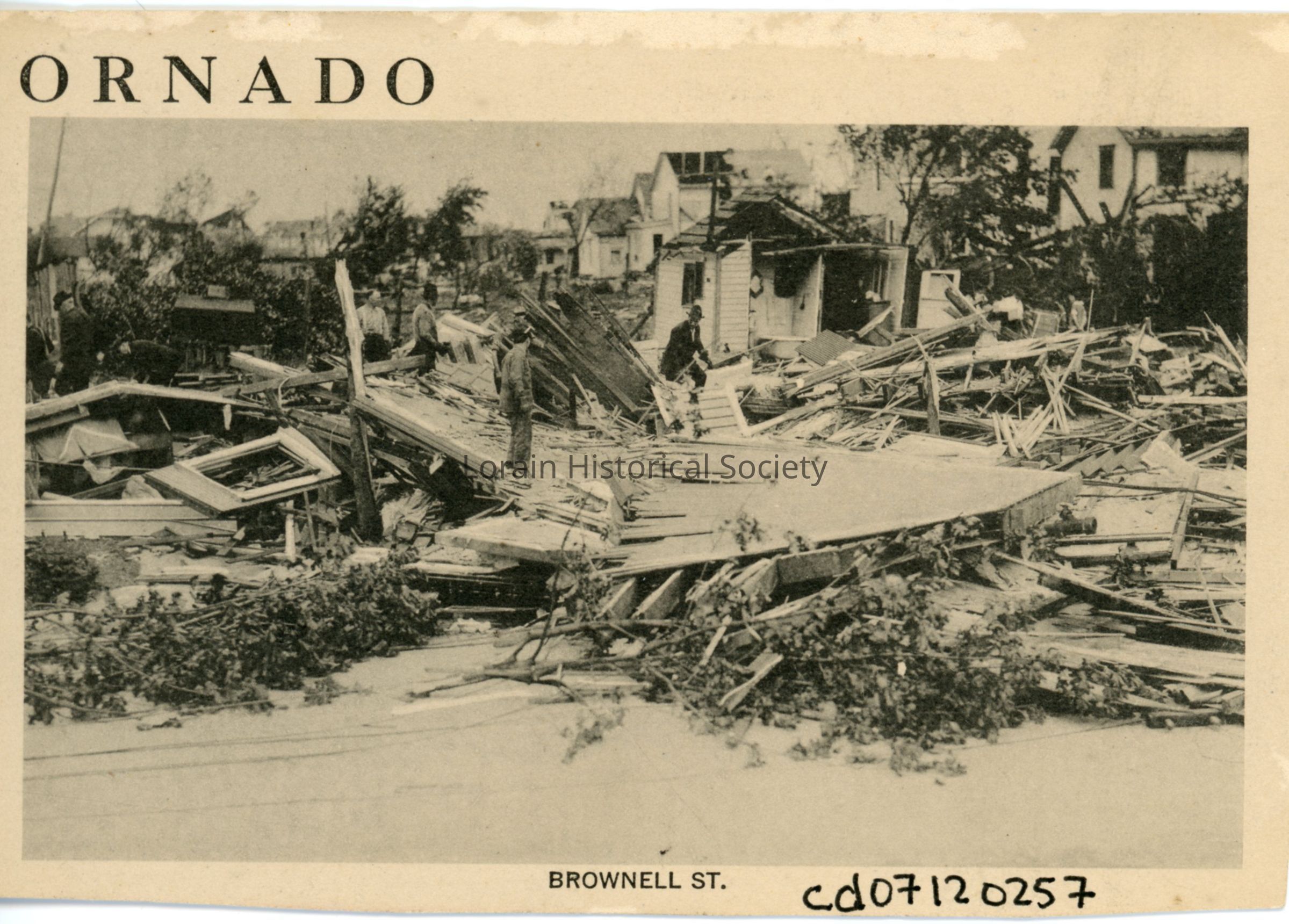Postcard print is view of 618 Brownell Avenue, Mary and Wiliam Connor Home, showing exposed bathroom and bedroom from second floor which is now on ground level, surrounded by debris from other destroyed houses from 1924 Tornado. Postcard print reads: "BROWNELL ST.".Acquisition