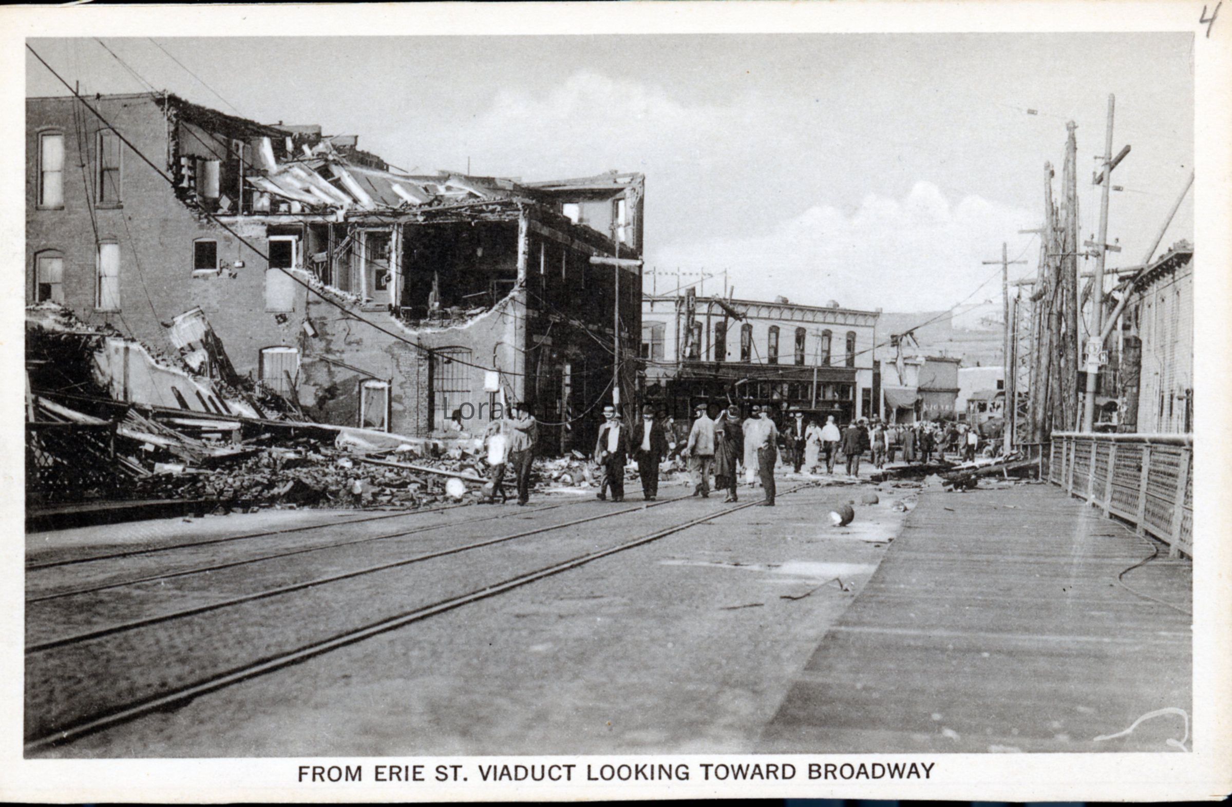 Postcard print is view of buildings at corner of West Erie Avenue and Broadway showing damage and destruction from 1924 Tornado. Left to right: Reagan's Grocery Store (debris behind Wagner Buildimg), Wagner Building (corner of West Erie Avenue and Broadway), and Heilman's Restaurant (corner of West Erie Avenue and Broadway across the street from the Wagner Building). Postcard reads: "FROM ERIE ST. VIADUCT LOOKING TOWARD BROADWAY".Acquisition