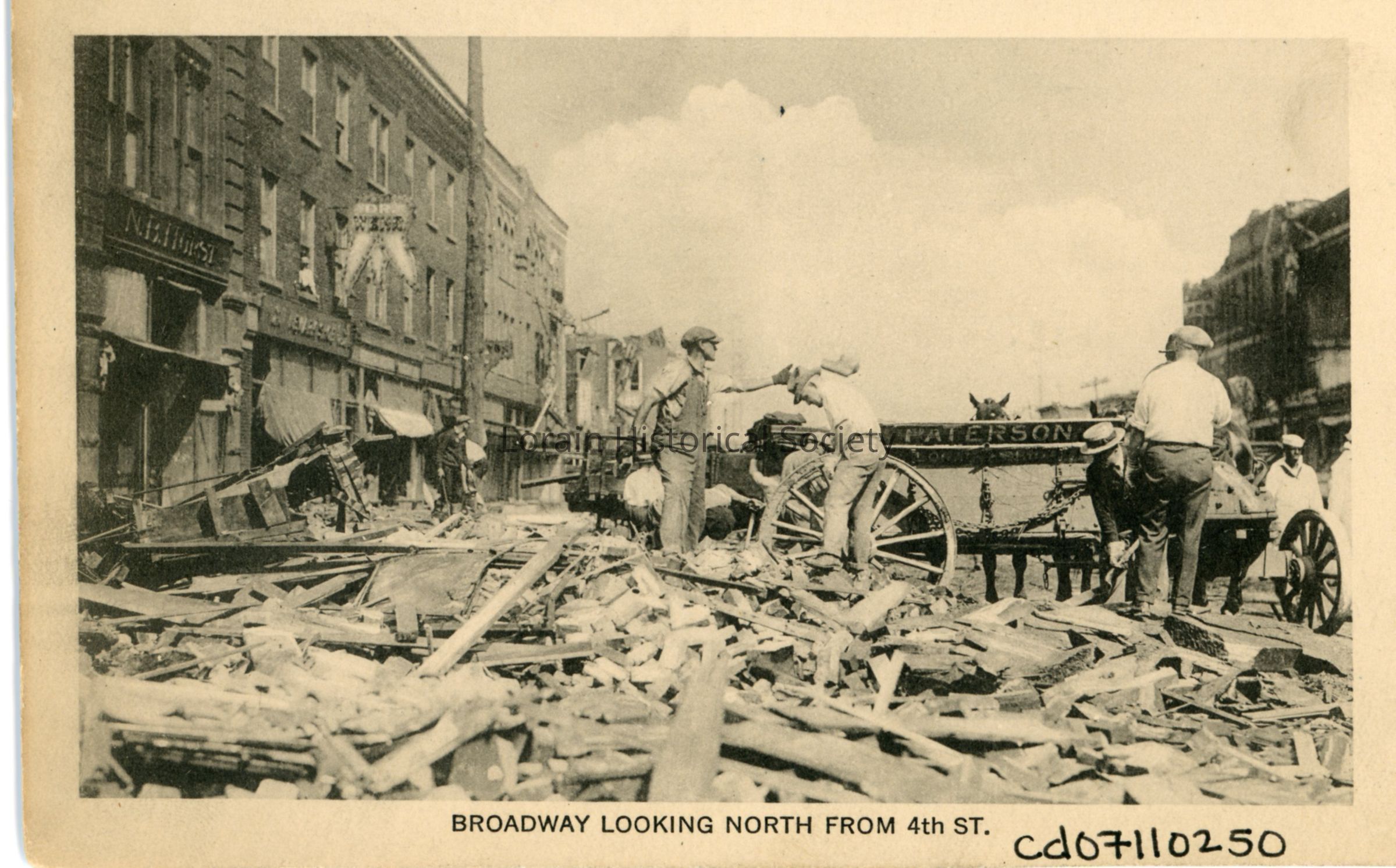 Poster photograph is black and white view of Broadway looking north from West Fourth Street, showing workmen cleaning up debris from 1924 Tornado. Debris is being tossed and shoveled into a horse drawn cart that reads "Paterson".