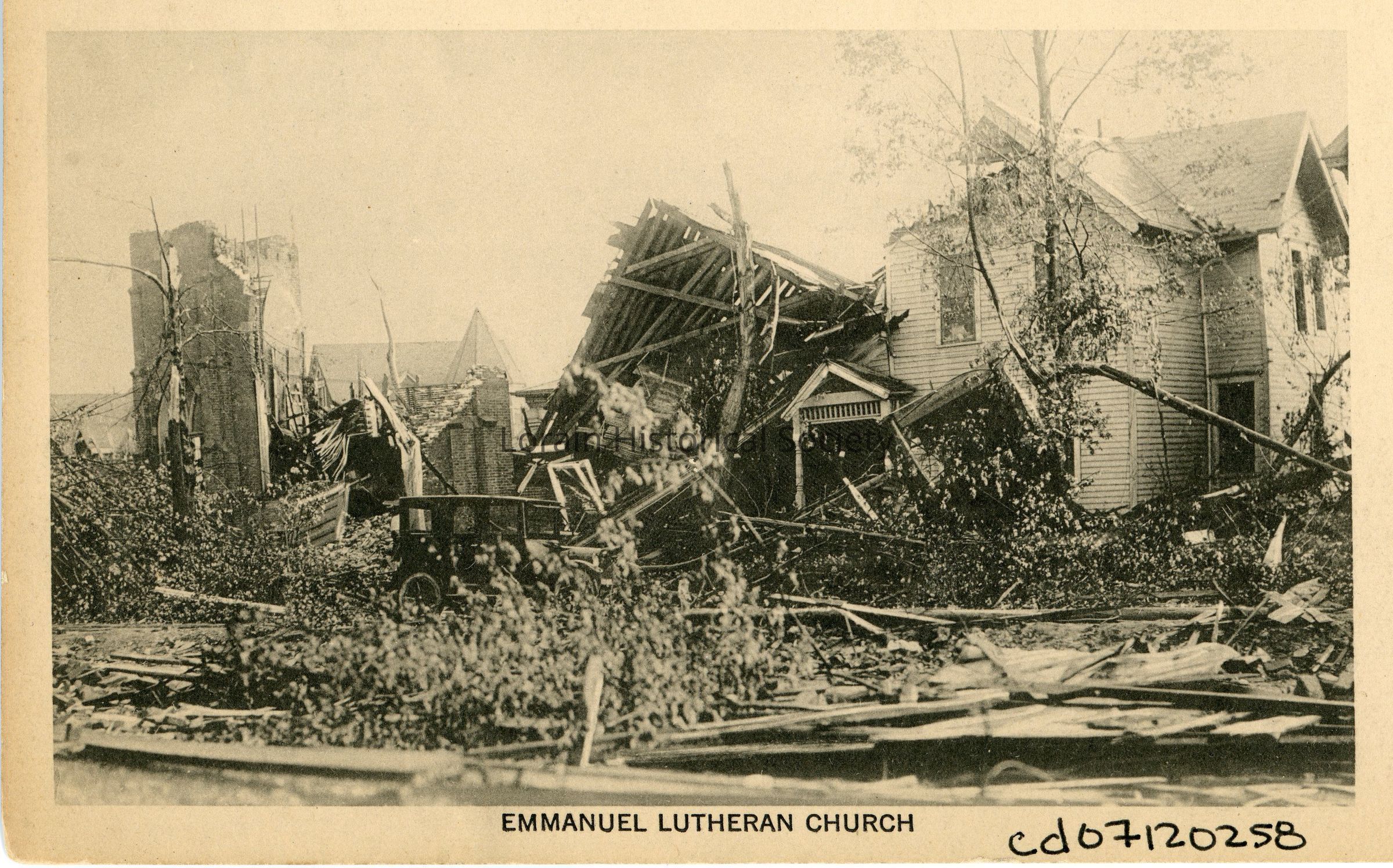 Poster photograph is black and white view of Emmanuel Evangelical Church, northwest corner of West Sixth Street and Reid Avenue, showing destruction from 1924 Tornado.