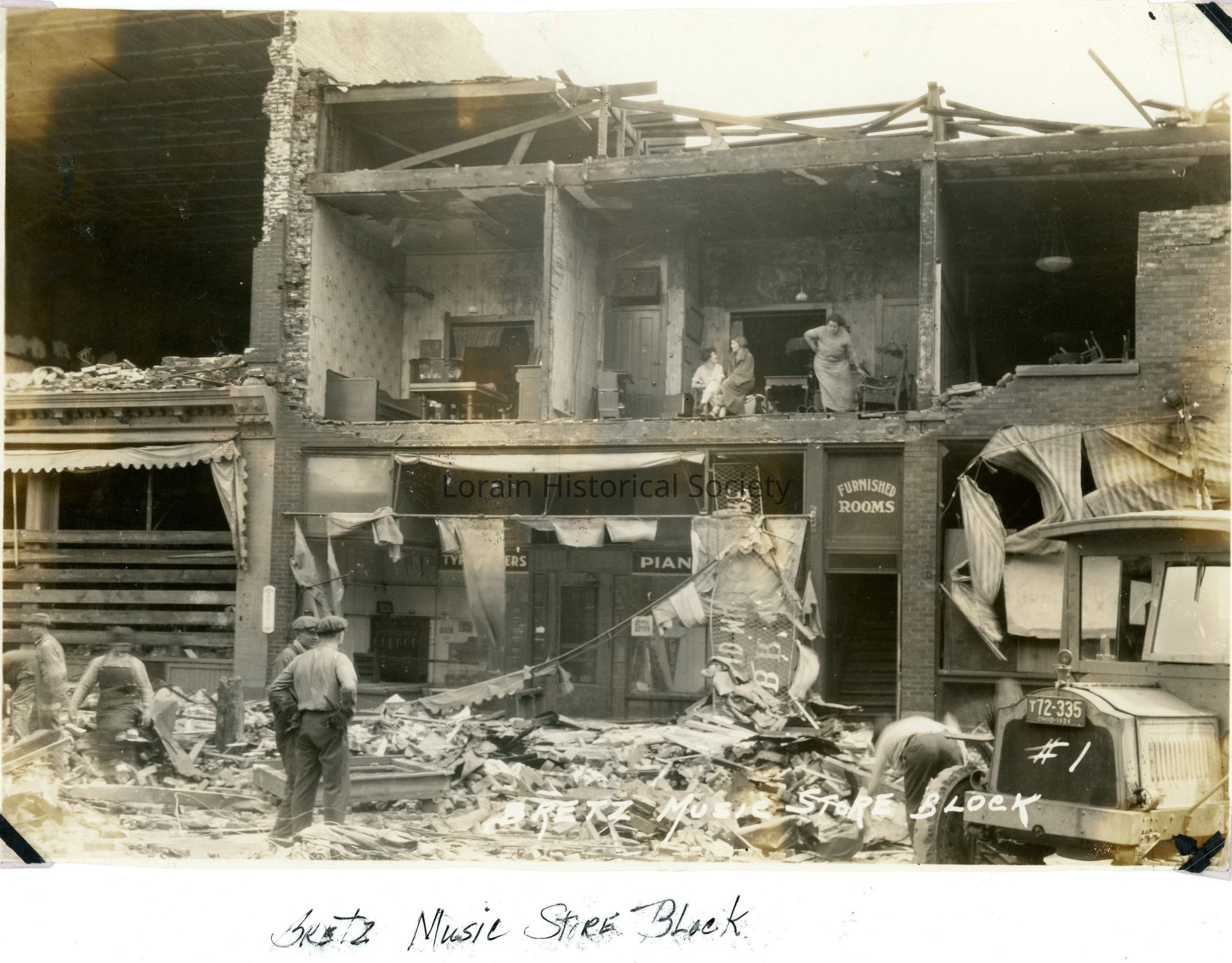 Photograph is black and white view of Bretz Music Store Block showing damage and destruction from 1924 Tornado. Note the people on the second floor in the furnished rental rooms.Acquisition