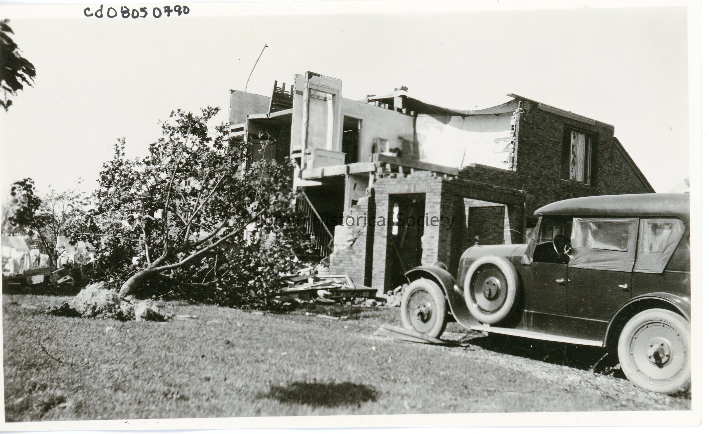 Photograph is black and white view of unidentified house with old Carroll Six Car in front, showing damage and destruction from 1924 Tornado.Context