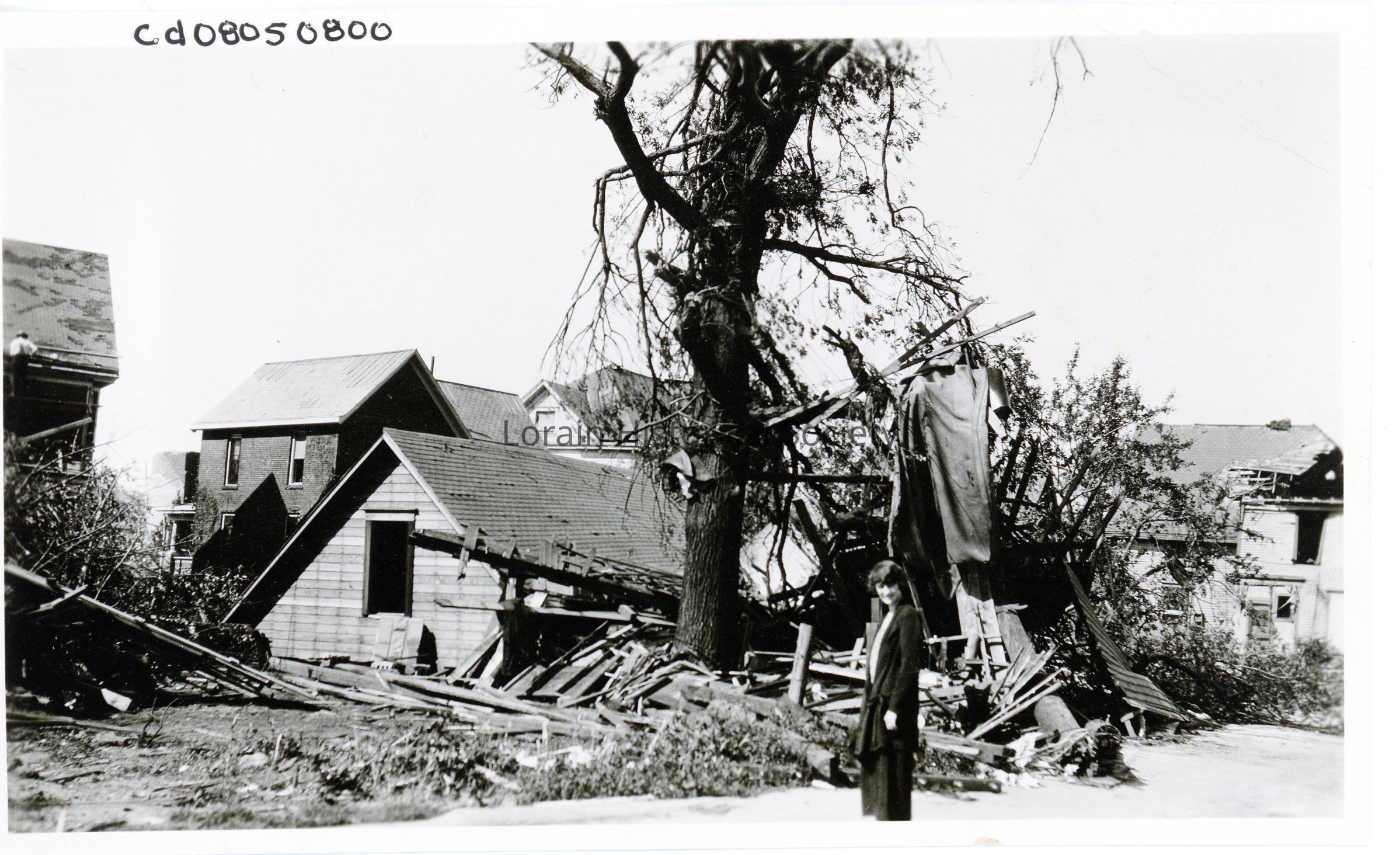 Photograph is black and white view of unidentified houses showing damage and destruction from 1924 Tornado.