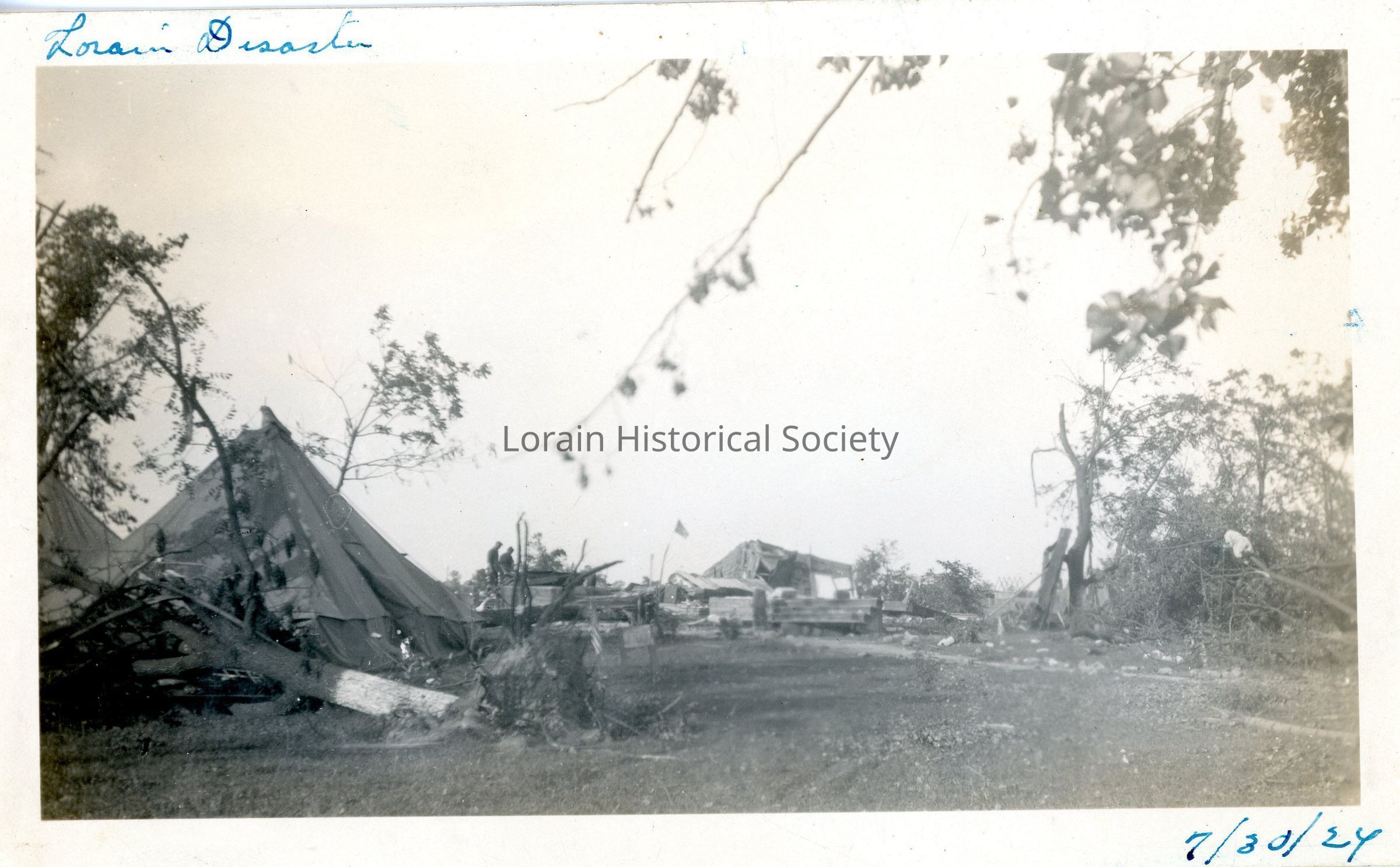 Photograph is black and white view of unidentified house destroyed by 1924 Tornado with tent on property. Written on photo: "Lorain Disaster 7/30/24".Photograph Details