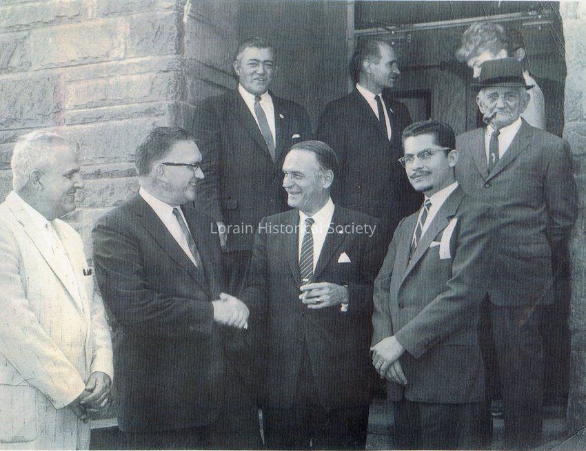 Photograph taken in front of the Puerto Rican home in 1963 on Vine Avenue. Includes Luis A. Velez, Andrieta's husband and then President of the Puerto Rican Home; Don Luis A. Ferre, Governor of Puerto Rico; Thomas Arias, first President of the Puerto Rican Home; and Mr. Nosher, possibly a congressman (?).Collection