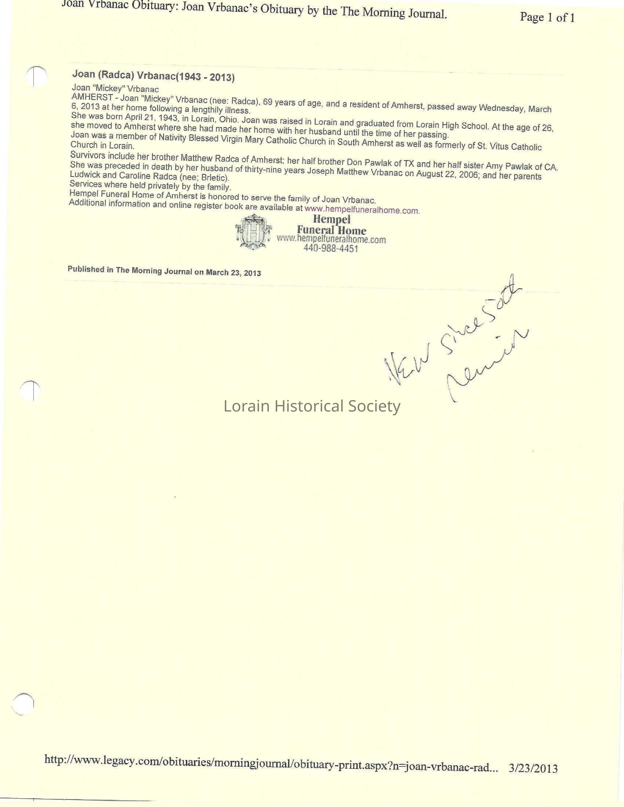 Radca, Joan Mickey Vrbanac obit