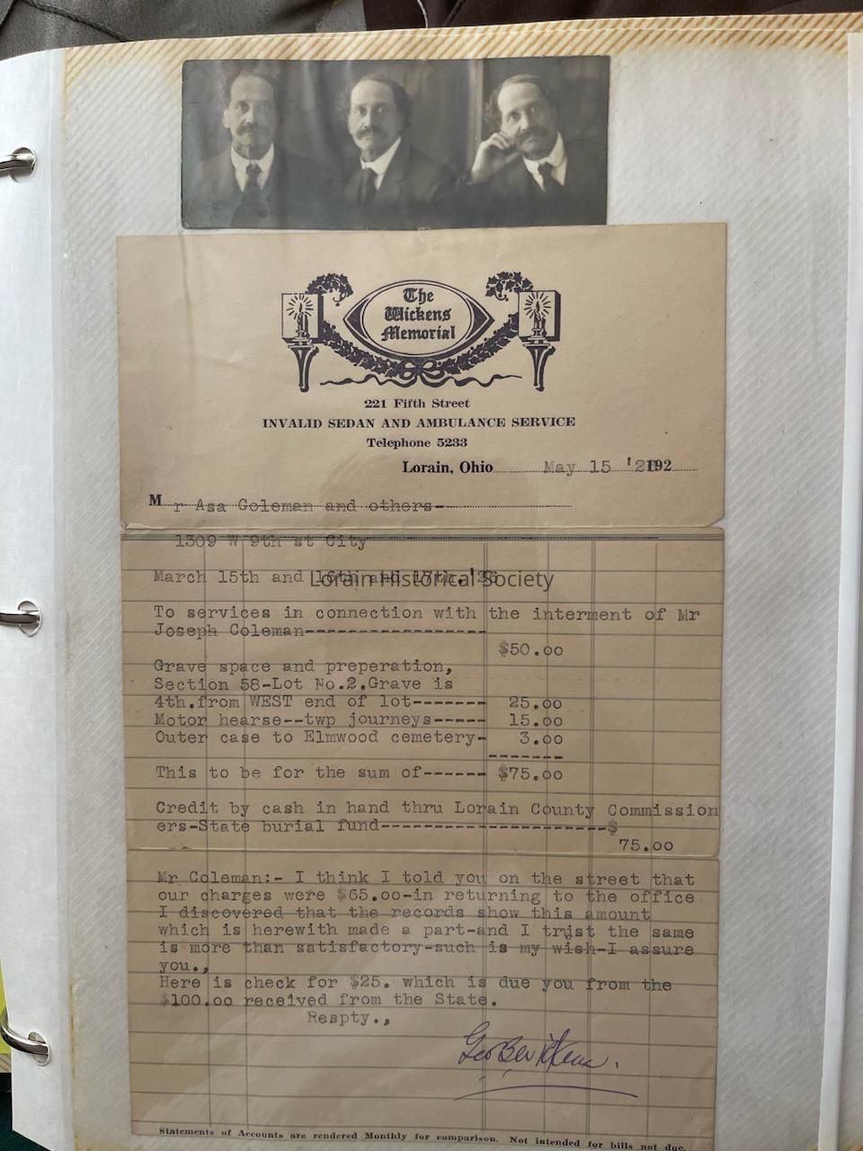 This receipt from the Wickens Memorial dated May 15, 1926 was written to Asa Coleman for the interment of his son Joseph Coleman. The photos at the top are of Asa Coleman.Collection