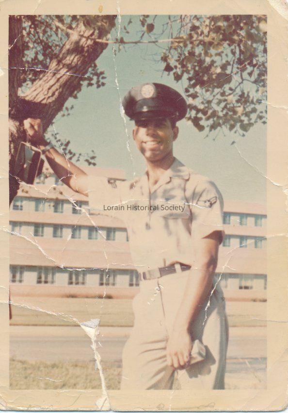 Rigoberto Reveron in uniform at Sheppard Air Force Base. Leaning against a tree, outside the hospital for the Sheppard AFB. During Vietnam War Service.Collection