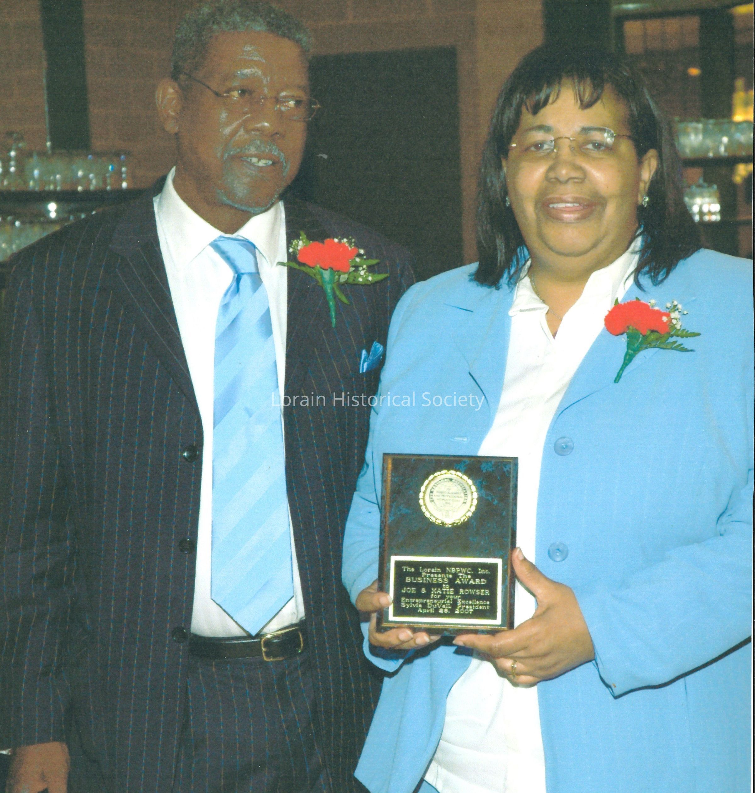 This photo of Mr. and Mrs. Joe Sr. and Katie Rowser was taken in April of 2007 at the annual event of the Lorain chapter of Negro Business and Professional Women's Club, where they were honored with a Business Award.Collection