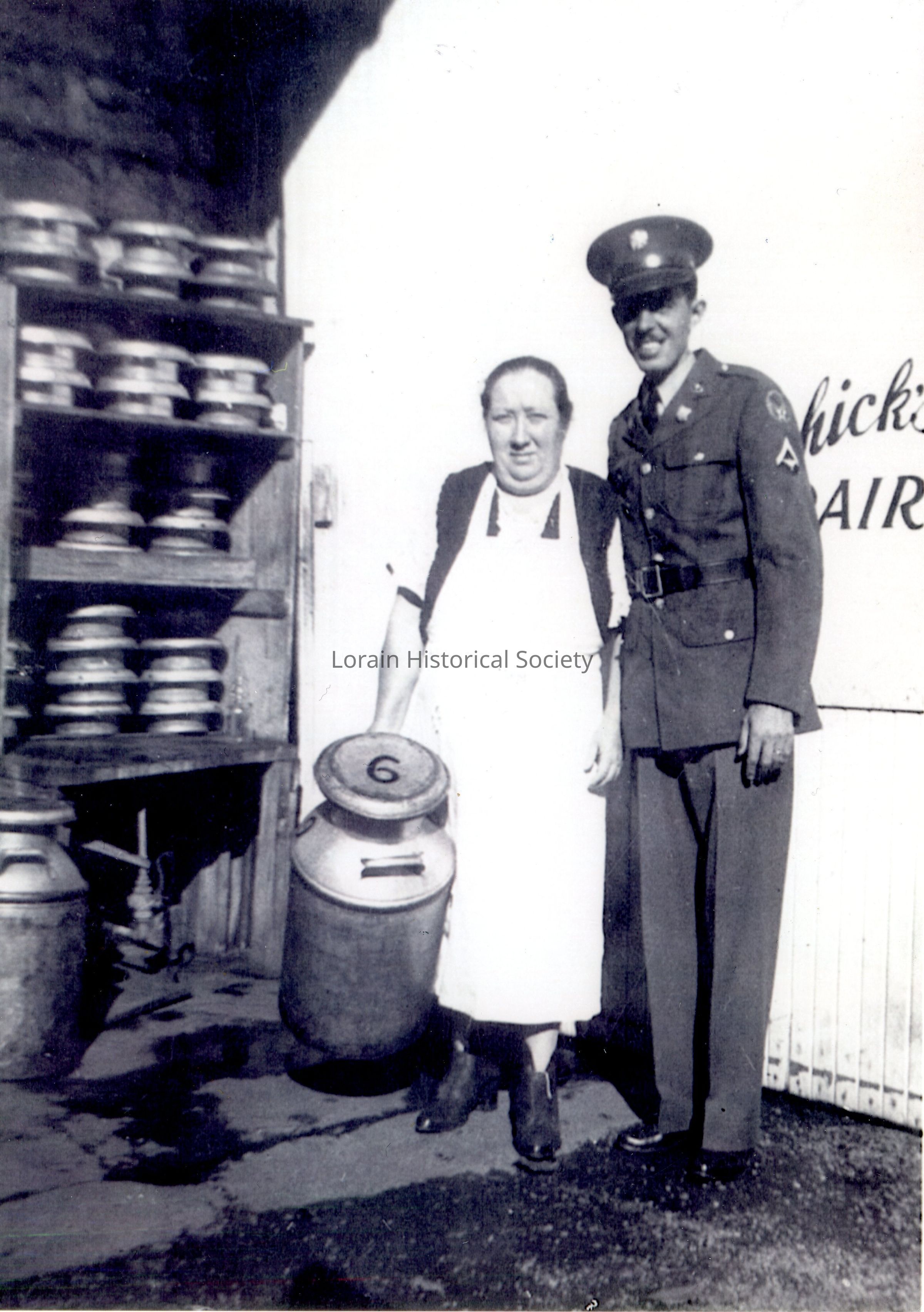 Image of a woman, Sadie Chick and a man (possibly a relative) named John Loczi-Czik. Sadie is holding a milk churn. John is wearing a military uniform. There are other milk churns and a shelf in the background. There is a sign behind John for "Chick's Dairy."
