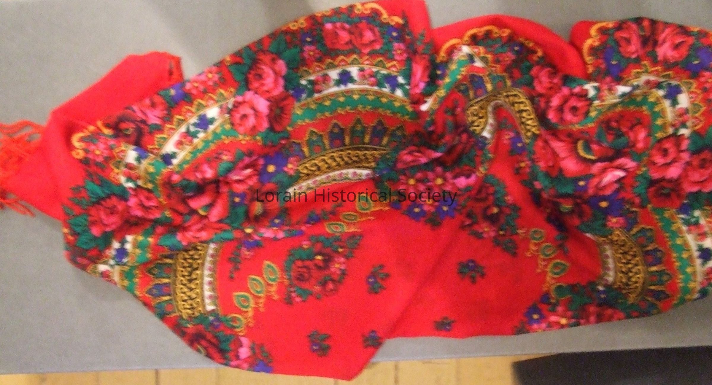 A square, light wool wrap/scarf with a flower design on a red background. There is red yarn "fringe" on all four sides. This is part of an ethnic Croatian womens' dress/outfit.Acquisition