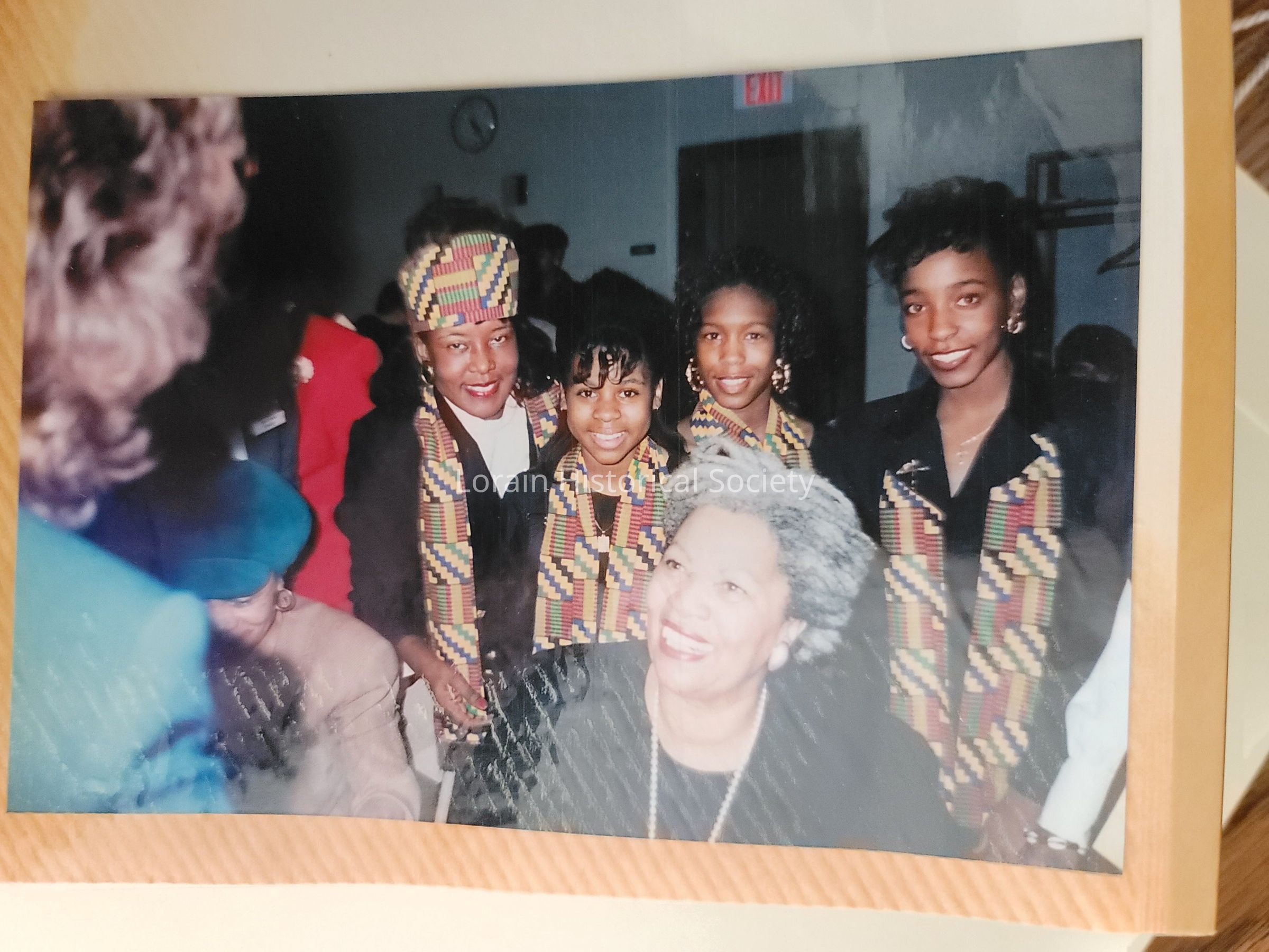 Scrapbook LCABSE - photographs of unidentified people at programs, award ceremonies, and with Toni Morrison at dedication of library reading room. Gloria Noland is standing behind Toni Morrison wearing a kinte printed hat. Seated next to Toni Morrison in a blue hat is poet Sonia Sanchez. Also a list of officers, program committee, and members. ca 1980s and 1990sContext