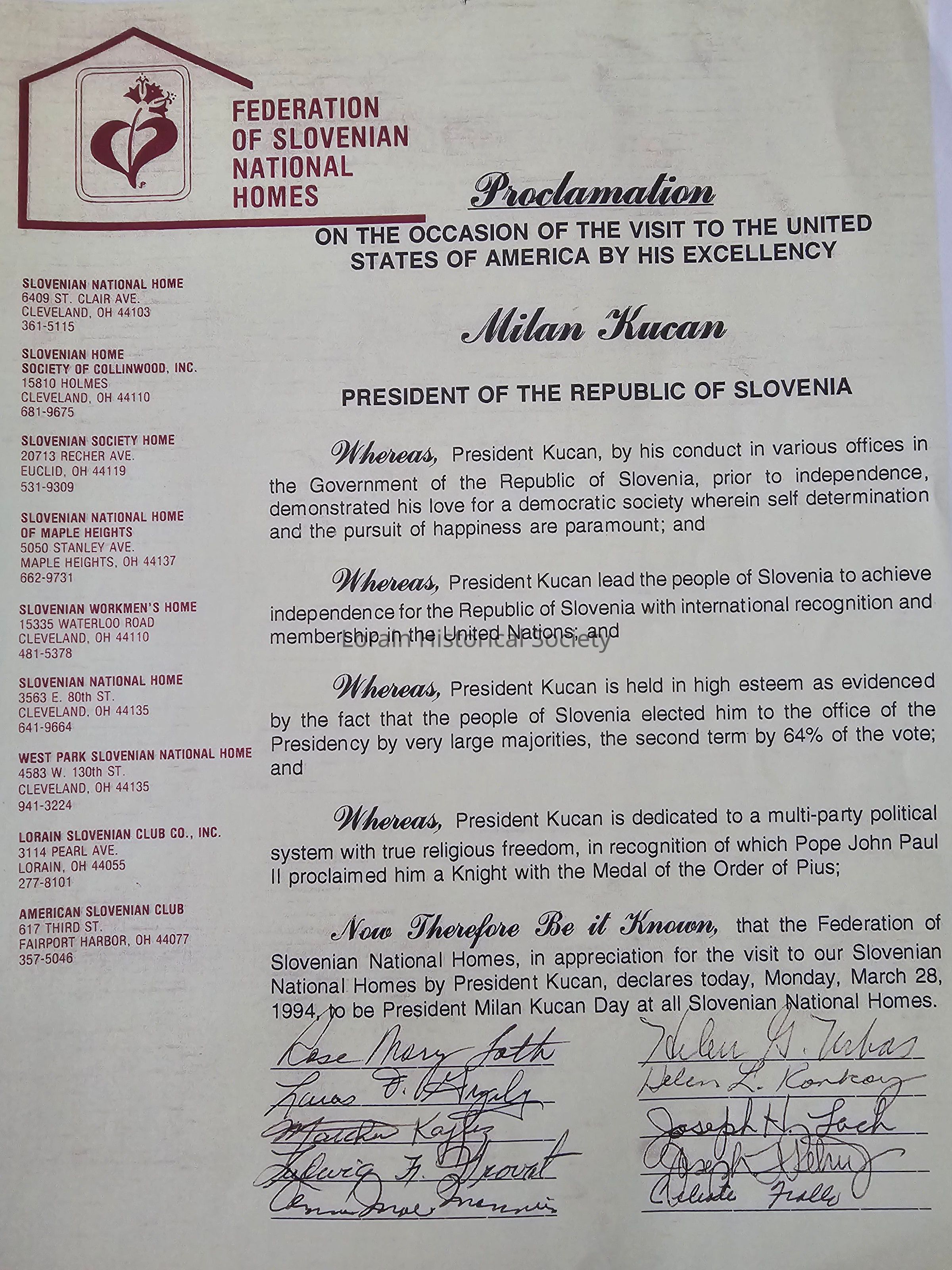 A color photocopy of the Federation of Slovenian National Homes Proclamation on the occasion of the visit to the United States of America by his Excellency, Milan Kucan, President of the Republic of Slovenia. In appreciation for Kucan, Monday, March 28, 1994 was declared as President Milan Kucan Day at all Slovenian National Homes.Archive Details
