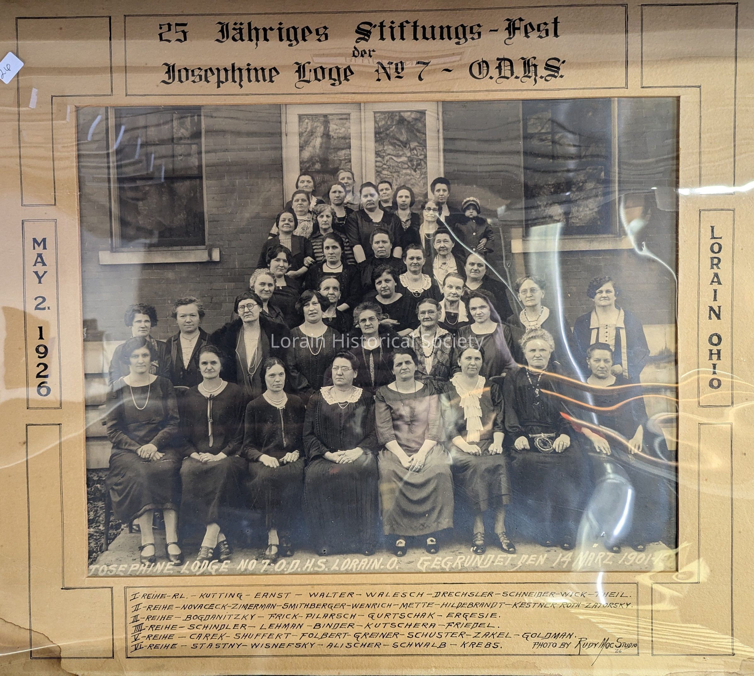 Large poster celebrating the 25th anniversary of the Orden der Hermannssöhne (ODHS - Sons of Hermann), Josephine Lodge #7 with a black and white photo of members in the center; names are written underneath by row; 1926Relationships