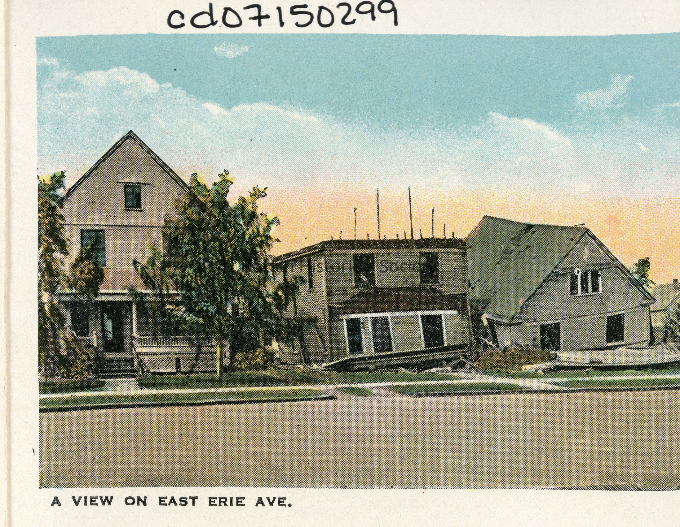 Souvenir Booklet Page is color view of unidentified houses on East Erie Avenue showing damage and destruction from 1924 Tornado.Acquisition