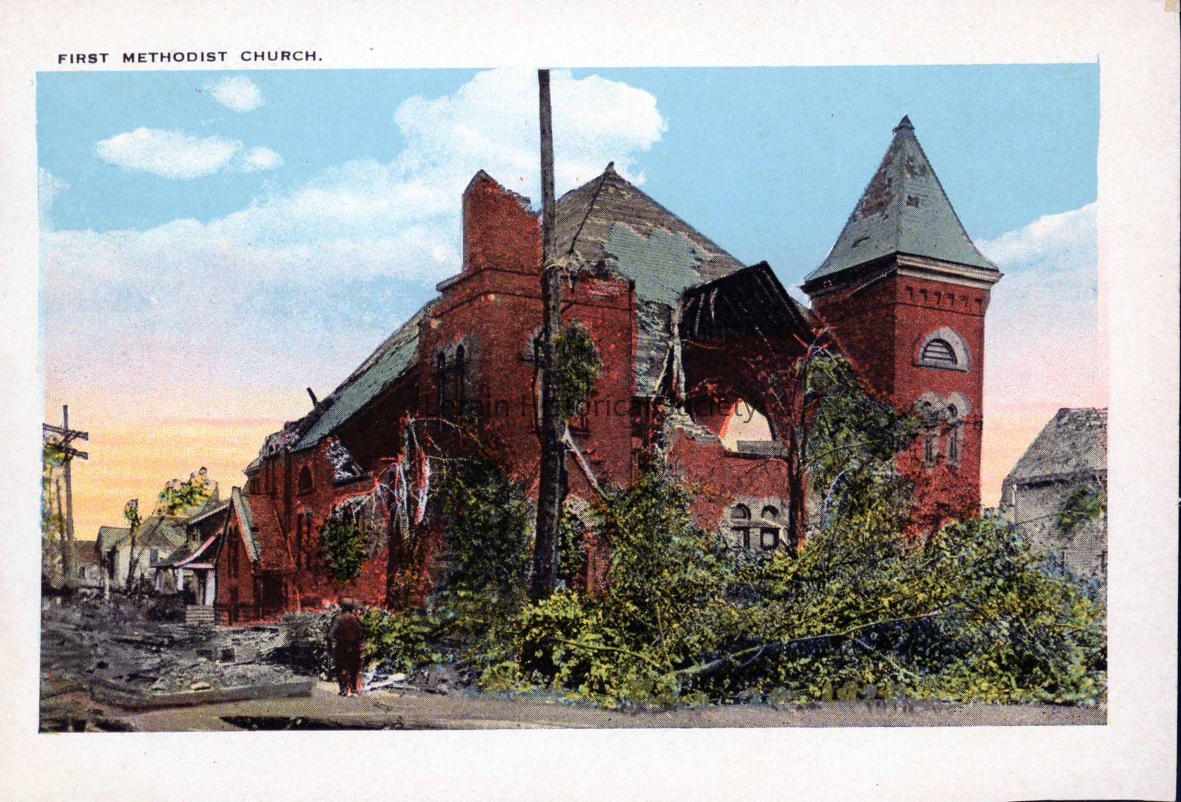 Souvenir booklet page is color view of First Methodist Church showing damage from 1924 Tornado. Souvenir booklet page reads: "FIRST METHODIST CHURCH".Acquisition