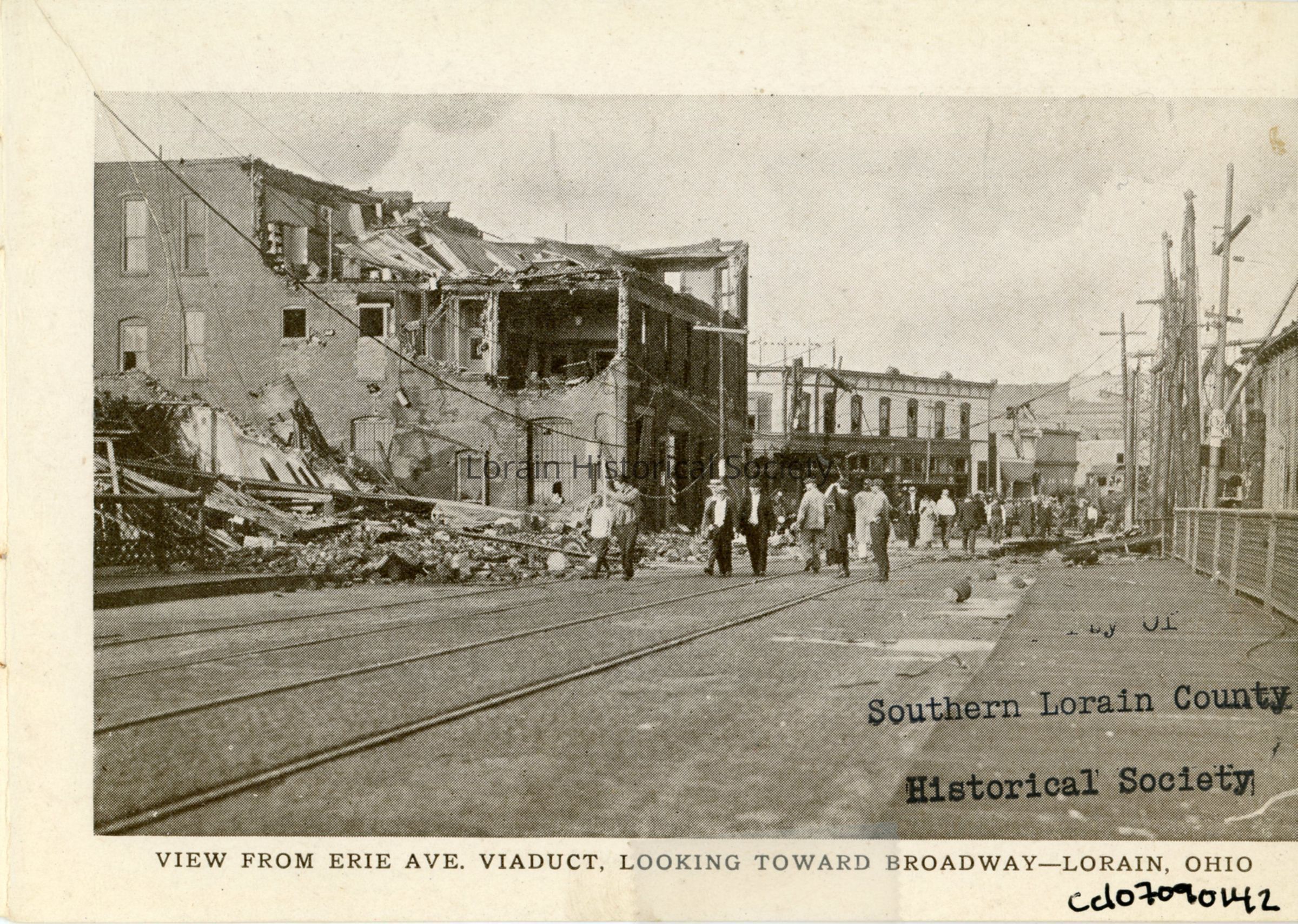 Souvenir Booklet Page is black and white view of Erie Avenue Viaduct looking west toward Broadway showing damage, destruction and debris from 1924 Tornado.