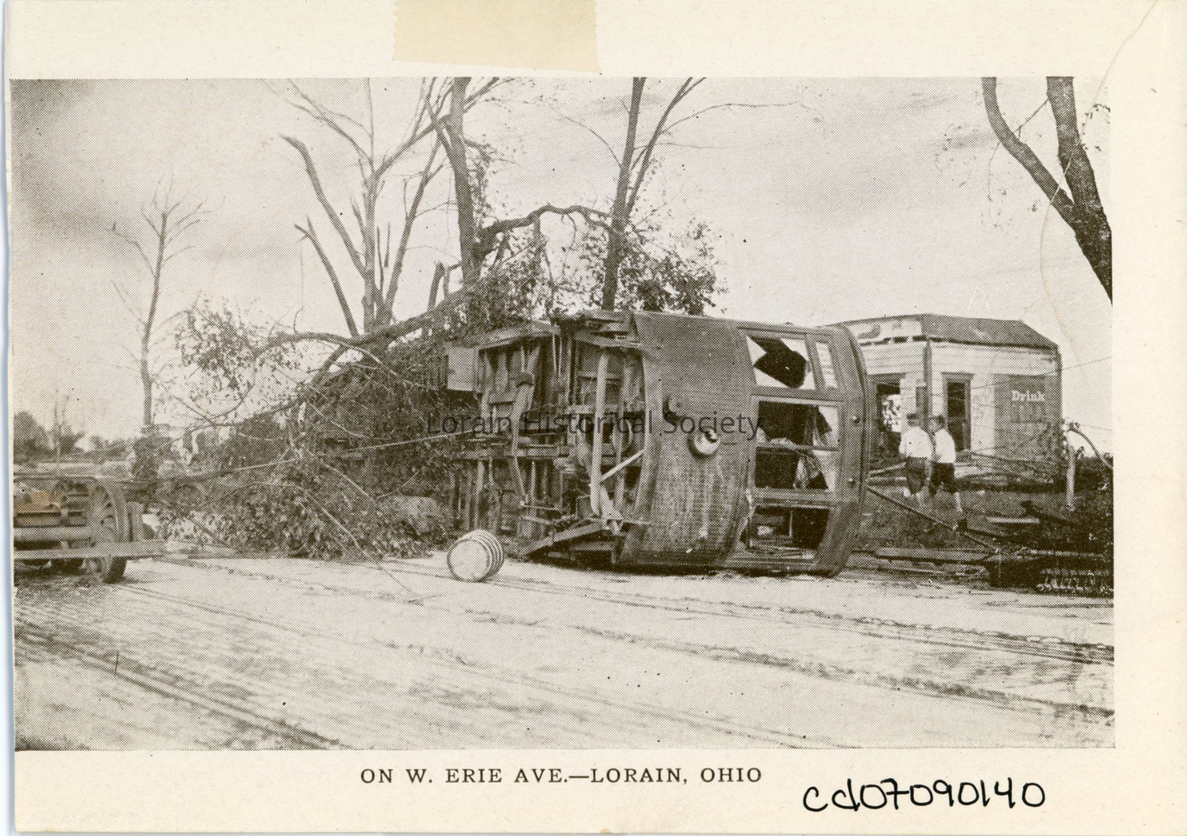 Souvenir Booklet Page is black and white view of streetcar that was overturned on West Erie Avenue during the 1924 Tornado.