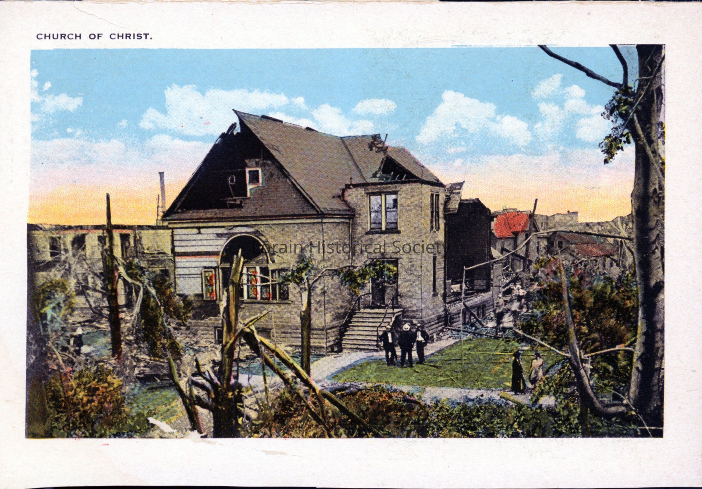 Souvenir booklet page is color view of Church of Christ, West 5th Street/Broadway, showing damage and destruction from 1924 Tornado. Souvenir booklet page reads: "CHURCH OF CHRIST".Acquisition