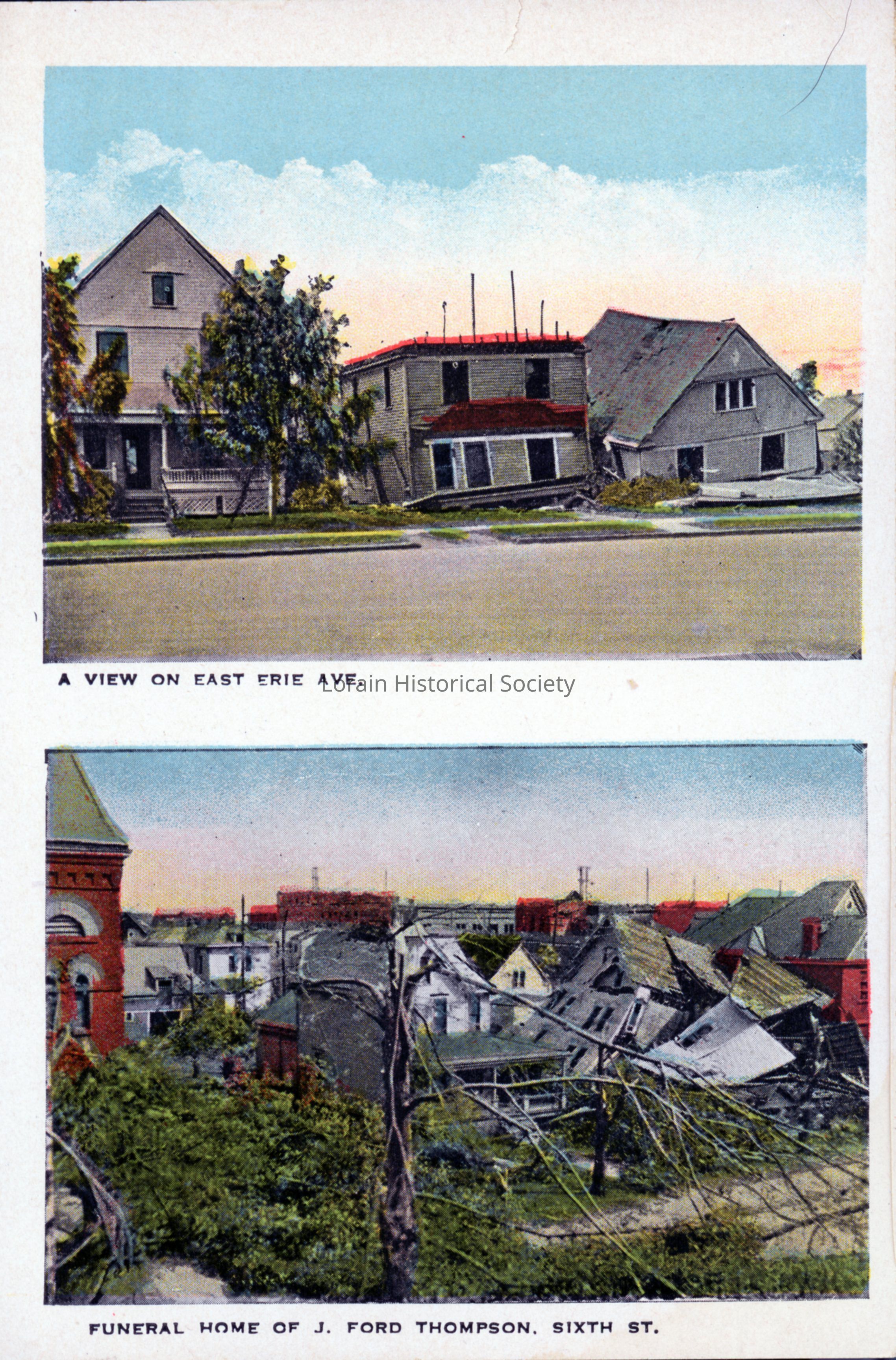 Souvenir booklet page is color view of (1) Homes on East Erie Avenue and (2) Funeral Home of J. Ford Thompson, 214 West Sixth Street, showing damage and destruction from 1924 Tornado. Souvenir booklet page reads: (1) "A VIEW ON EAST ERIE AVE." and (2) "FUNERAL HOME OF J. FORD THOMPSON, SIXTH ST."Acquisition