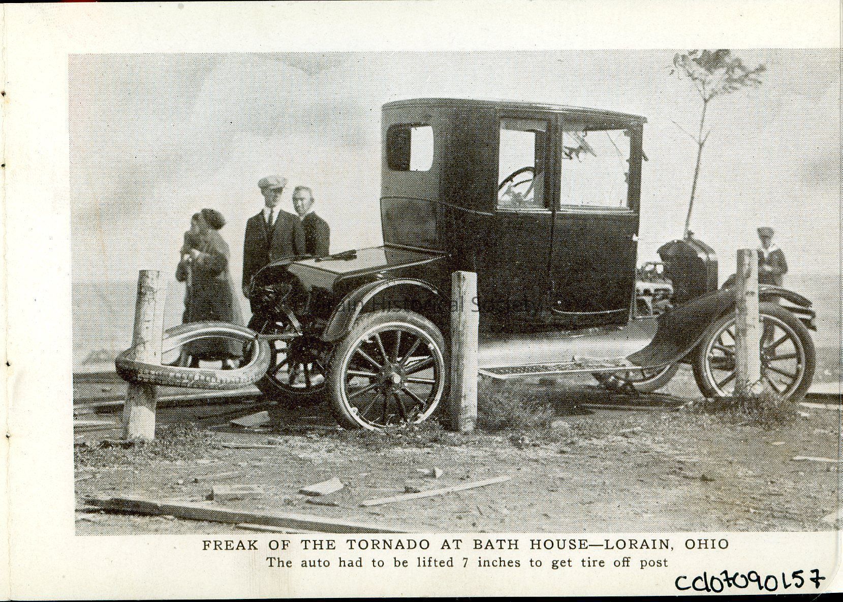 Souvenir Booklet Page reads: "FREAK OF THE TORNADO AT BATH HOUSE -- LORAIN, OHIO The auto had to be lifted 7 inches to get tire off post".Acquisition