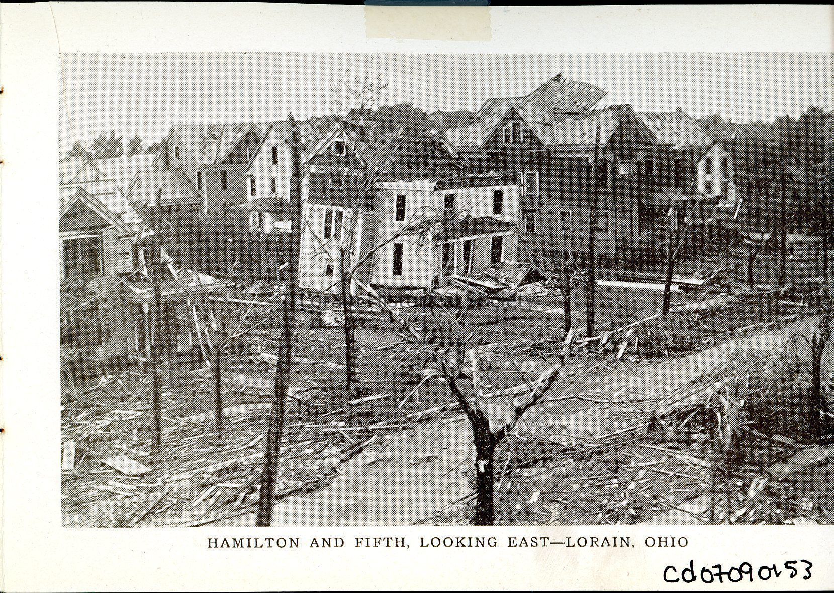 Souvenir booklet page is black and white view of houses on Hamilton Avenue and West Fifth Street, looking East, showing damage and destruction from 1924 Tornado.
