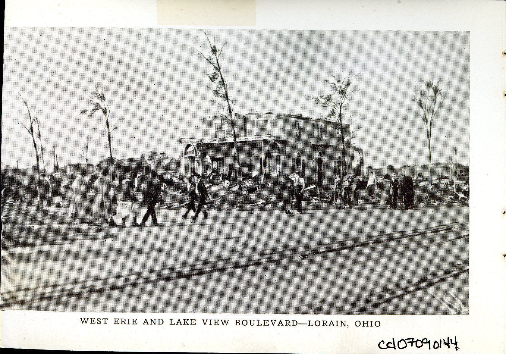 Souvenir booklet page is black and white view of corner of West Erie Avenue and South Lakeview Boulevard showing damage and destruction to 1405 West Erie Avenue, Minnie M. and Allison H. Babcock Home.