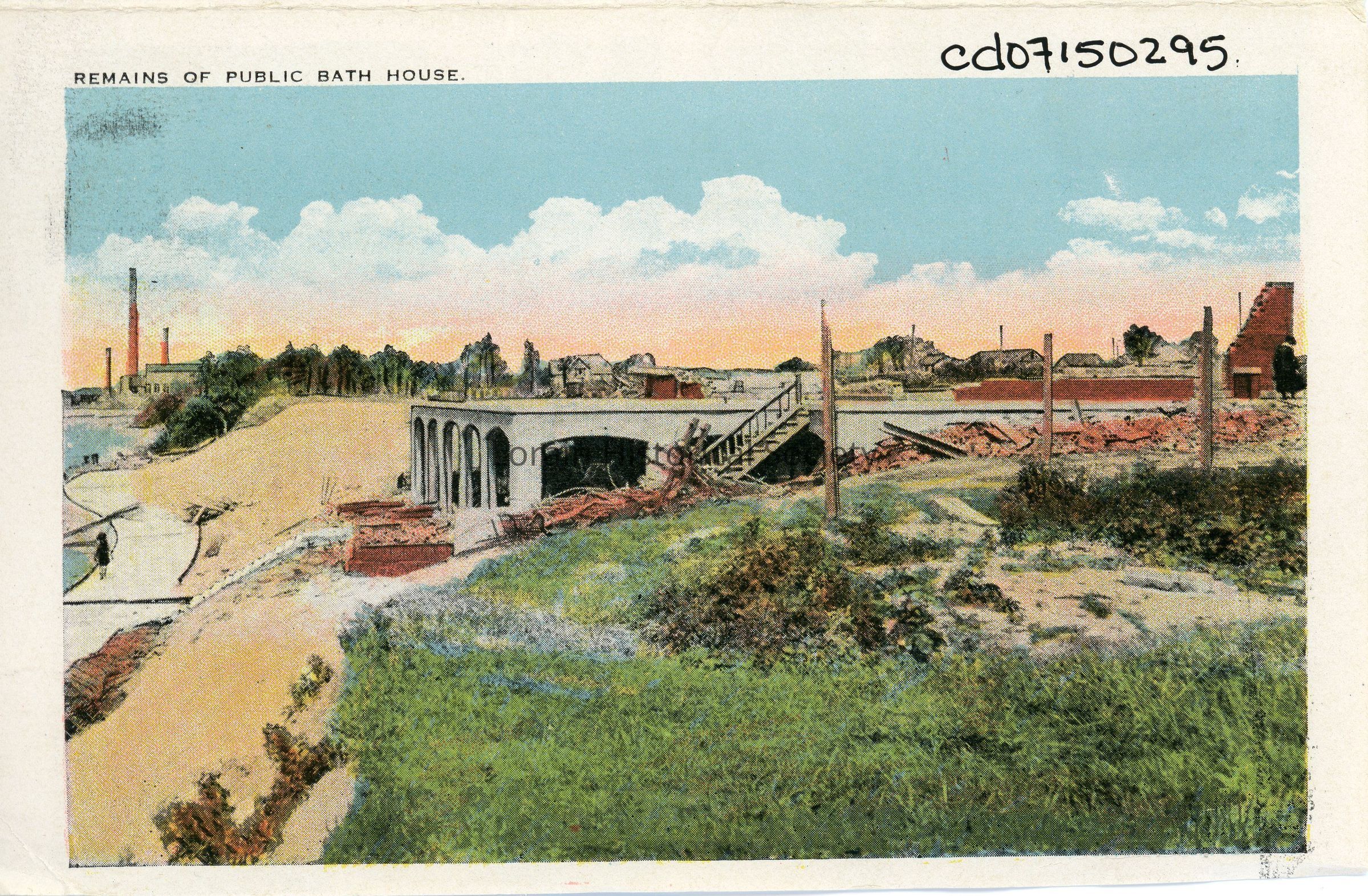 Souvenir booklet page is color view of the Lakeview Bath House showing damage and destruction from the 1924 Tornado.
