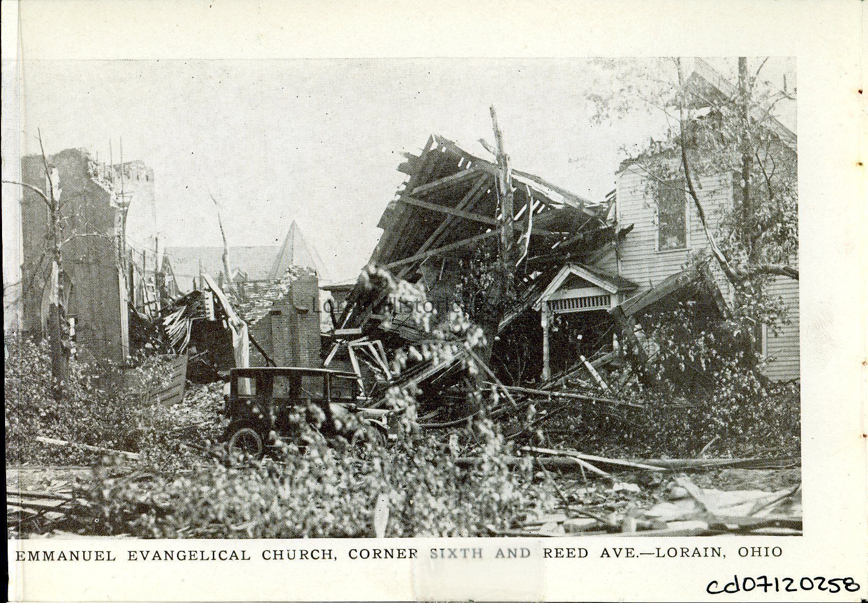 Souvenir booklet page is black and white view of Emmanuel Evangelical Church, corner of West Sixth Street and Reid Avenue, showing damage and destruction from 1924 Tornado. Caption reads: "Emmanuel Evangelical Church, Corner of Sixth and Reed Ave -- Lorain, Ohio".Acquisition
