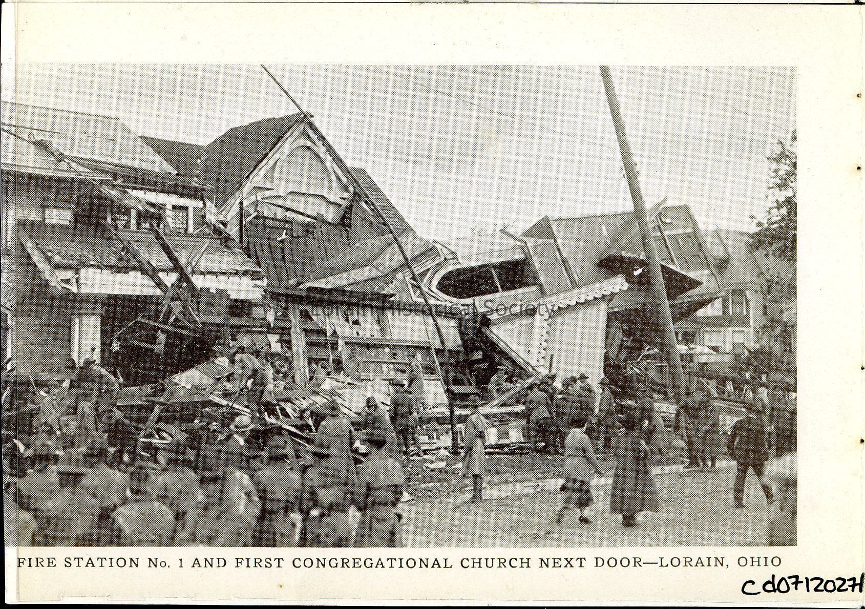 Souvenir Booklet Page is black and white view of First Congregational Church steeple which fell on No. 1 Fire Station next door during 1924 Tornado. Caption reads: "Fire Station No .1 and First Congregational Church Next Door -- Lorain, Ohio".Acquisition