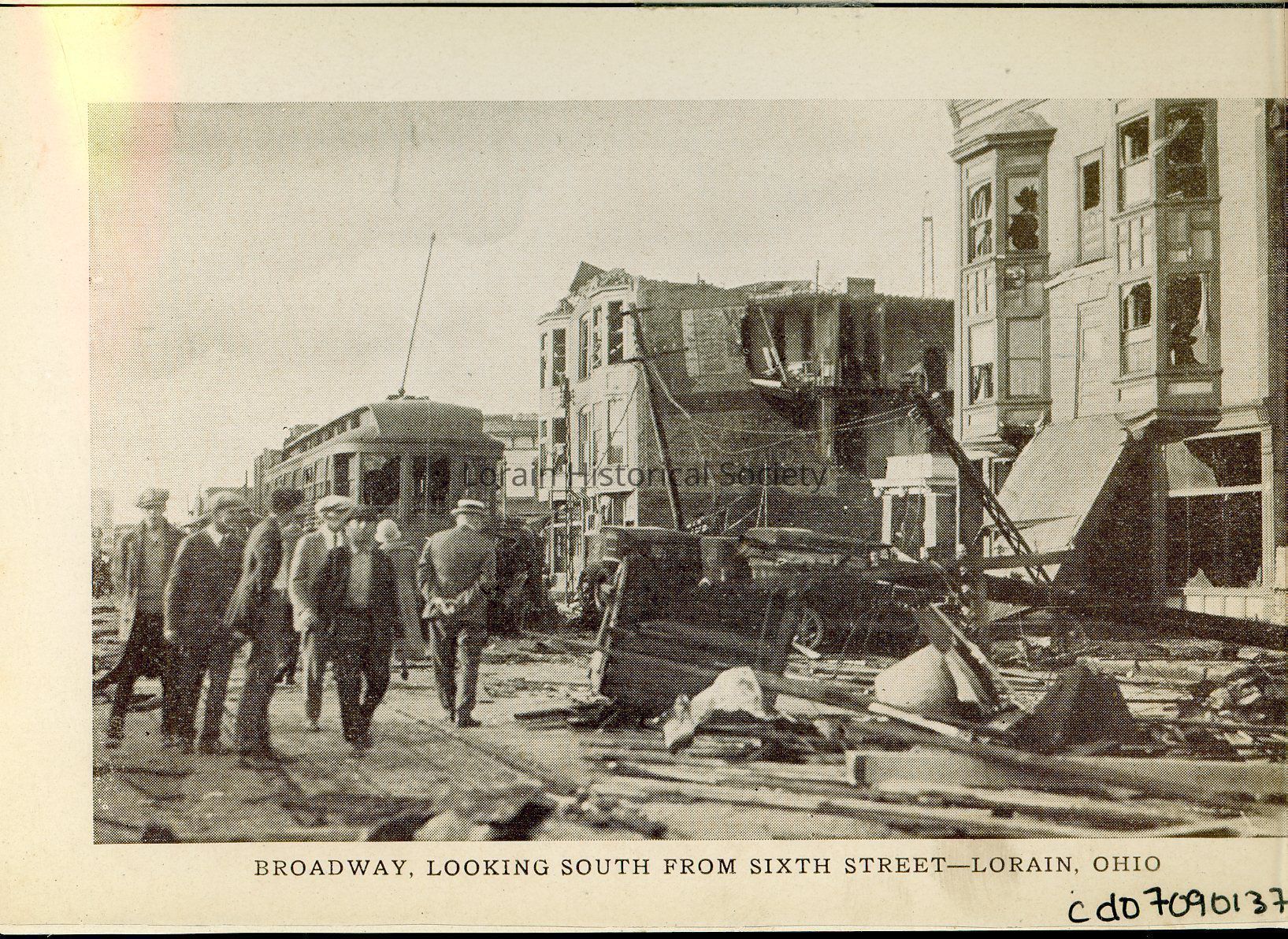 Souvenir booklet page is black and white view of west side of Broadway/North Broadway with damaged streetcar near the intersection of Broadway and Erie Avenue. The man in the straw hat with his hands behind his back is William N. Little, Real Estate, Insurance and Bonding. L to R: Black Hotel, 280-282 Broadway; Canfield Service Station, 276 North Broadway; William Gage Restaurant, 272 North Broadway; Overland Kilgore Co., 276 North Broadway.