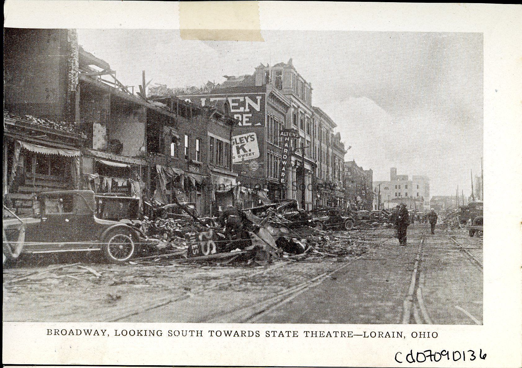 Souvenir booklet page is black and white view of east side of Broadway looking south toward State Theatre. L to R: 347-349 Broadway, Vacant buildings; Harry C. Stacey Restaurant, 351 Broadway; Alten Hardware, 353-359 Broadway; Wickens Building, 361-371 Broadway; State Theatre, 375 Broadway. Caption reads: "Broadway Looking South Towards State Theatre -- Lorain, Ohio".Acquisition