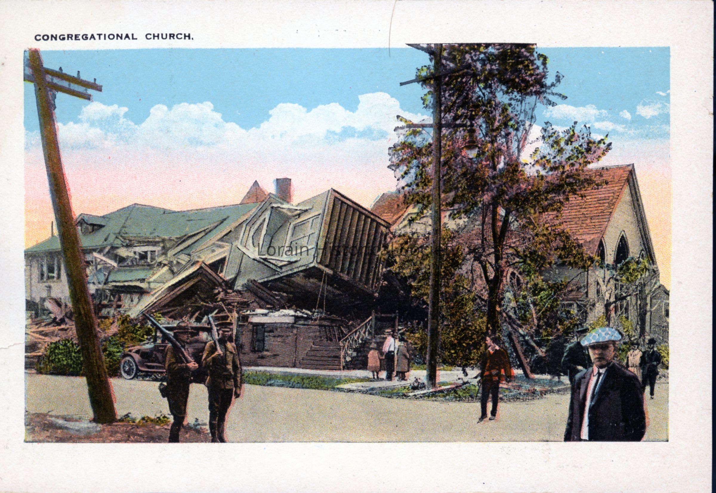 Souvenir booklet page is color view of First Congregational Church with steeple that fell on Fire Station No. 1 next door showing damage and destruction from 1924 Tornado. Souvenir booklet page reads: "CONGREGATIONAL CHURCH". Ohio National Guard in picture.Acquisition