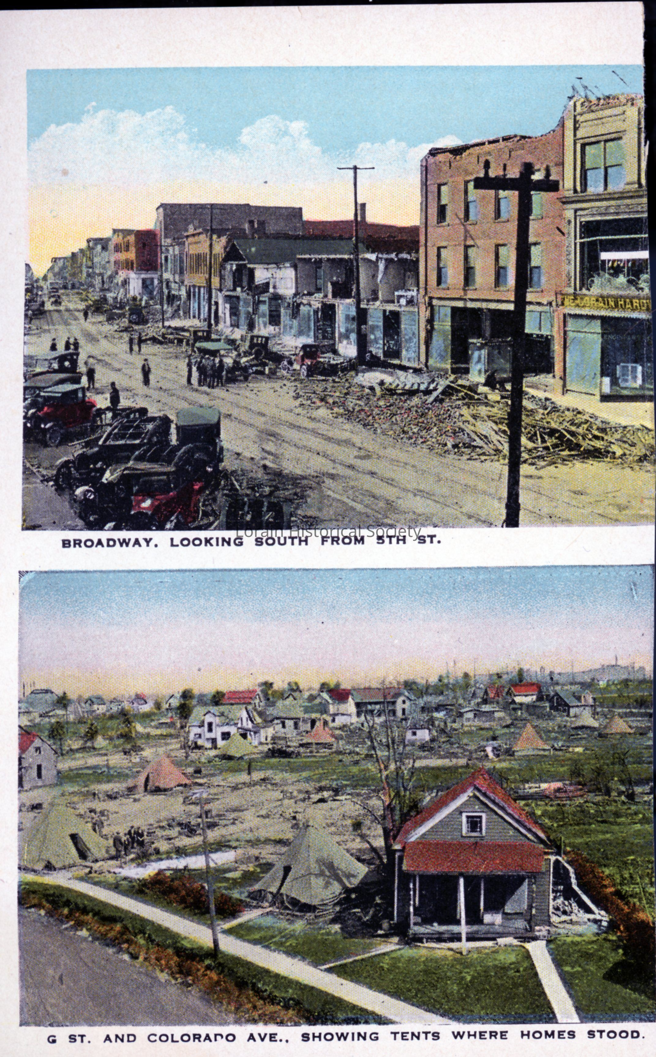Souvenir booklet page is two views of (1) East side of Broadway looking South from West Sixth Street showing damage and debris from 1924 Tornado and (2) G Street and Colorado Avenue showing destruction and damage of homes and tents where houses once stood. Souvenir booklet page reads: "G ST. AND COLORADO AVE., SHOWING TENTS WHERE HOMES STOOD".Acquisition