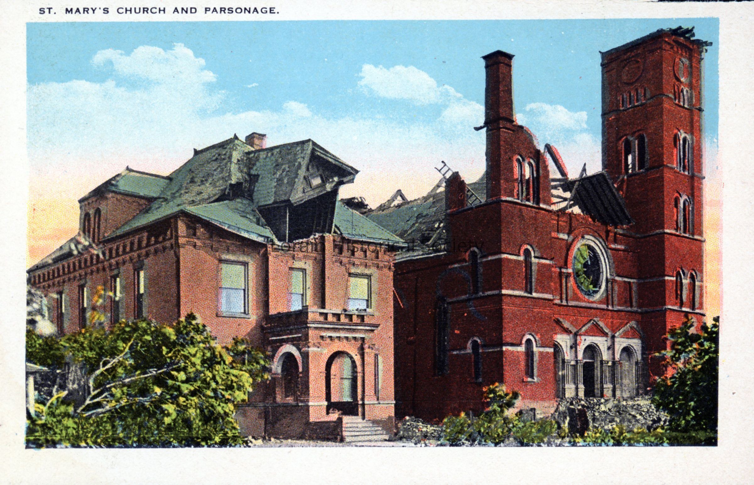 Souvenir booklet page is color view of St. Mary's Church and Parsonage showing damage and destruction from 1924 Tornado. Souvenir booklet page reads: "ST. MARY CHURCH AND PARSONAGE".Acquisition