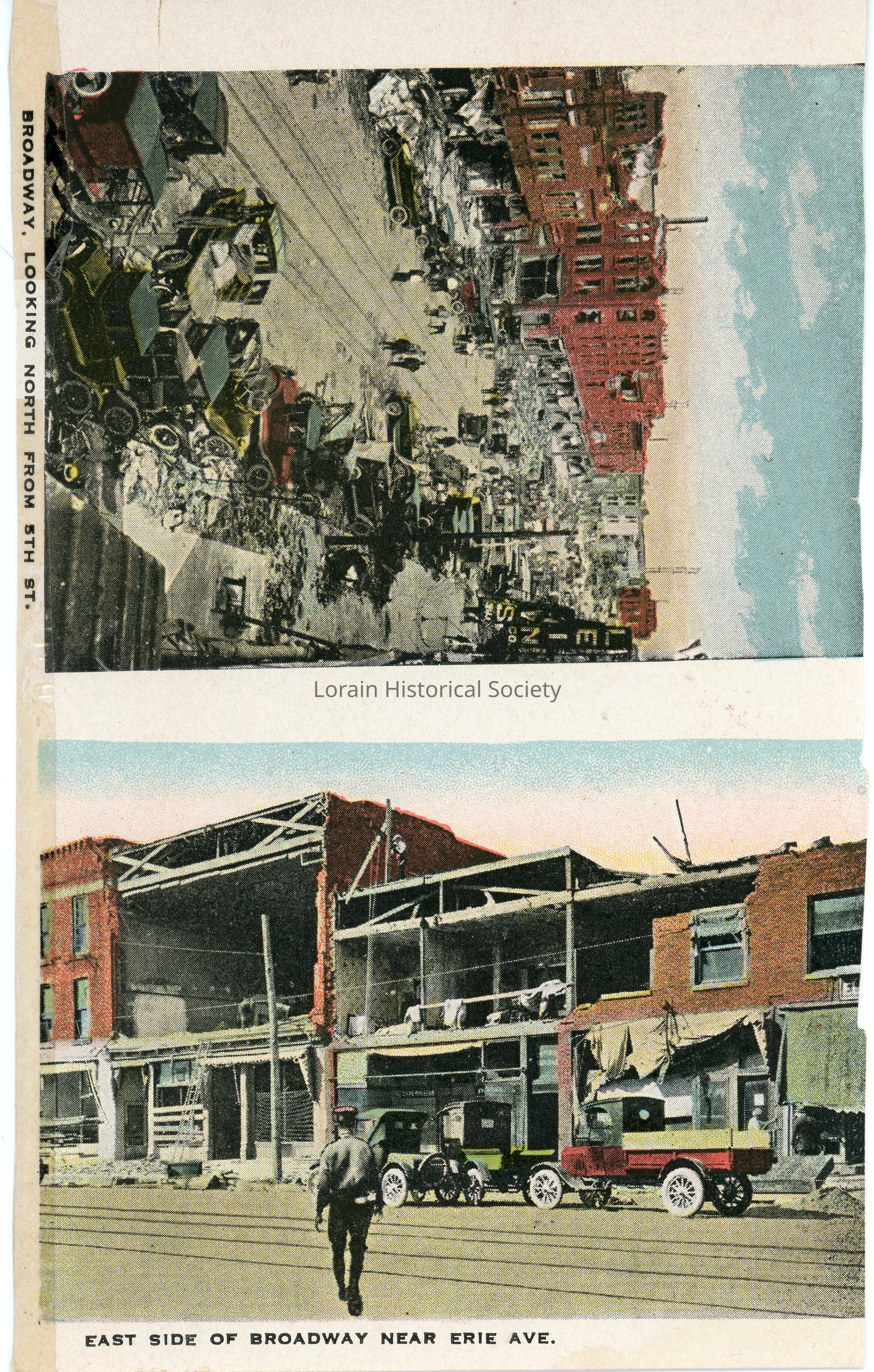 Souvenir booklet page is color view of (1) Broadway looking north from West Fifth Street and (2) East Side of Broadway near West Erie Avenue, showing damage and destruction from 1924 Tornado. Souvenir booklet page reads: (1) "BROADWAY LOOKING NORTH FROM 5th ST." and (2) "EAST SIDE OF BROADWAY NEAR ERIE AVE.".Acquisition
