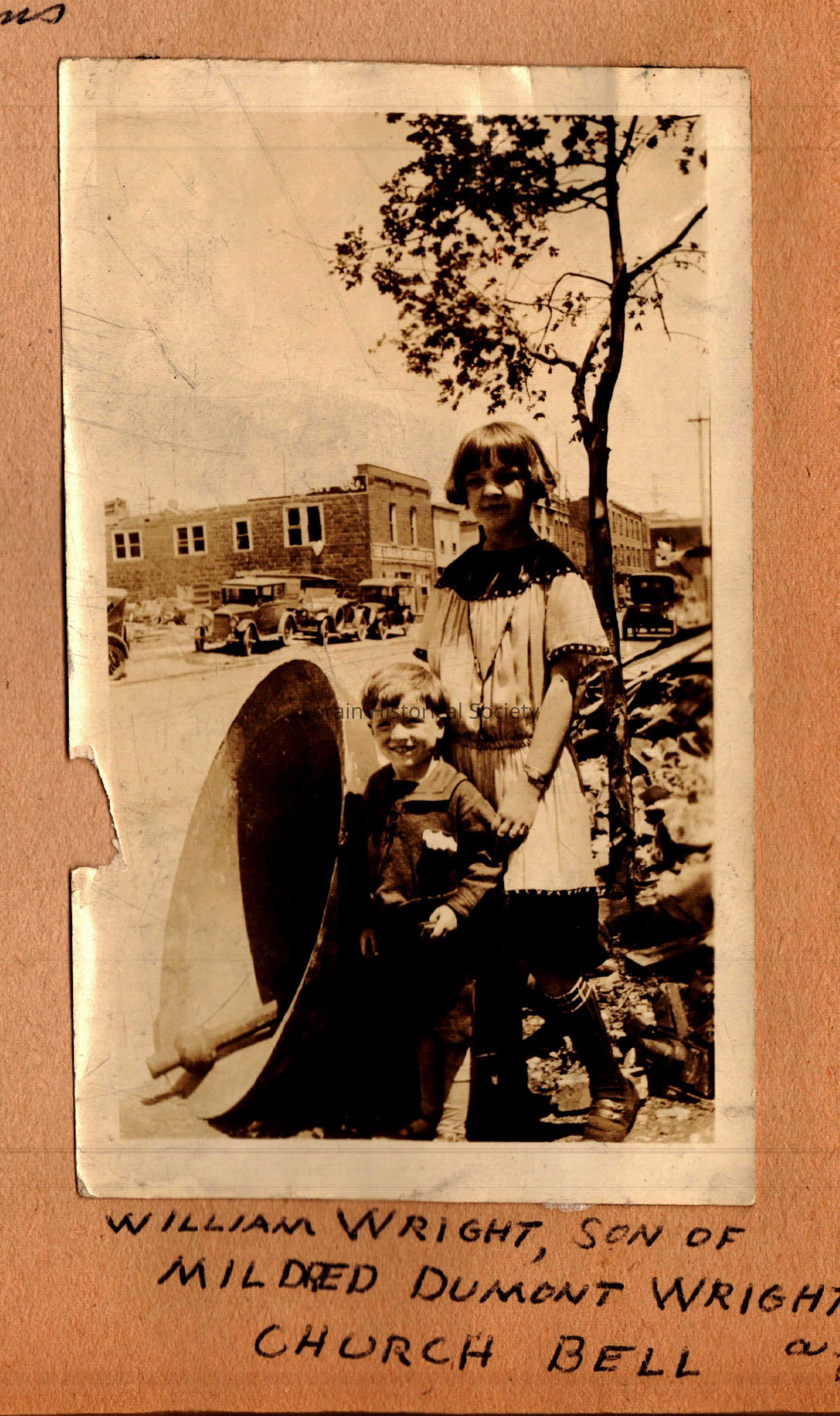 Three digital copies of photographs from St. John's Church after the 1924 tornado: William Wright, son of Mildred Dumont Wright with girl by street and next to church bell; friends of the Dumonts in front of church and by fallen tree. All copied from a scrapbook.Acquisition