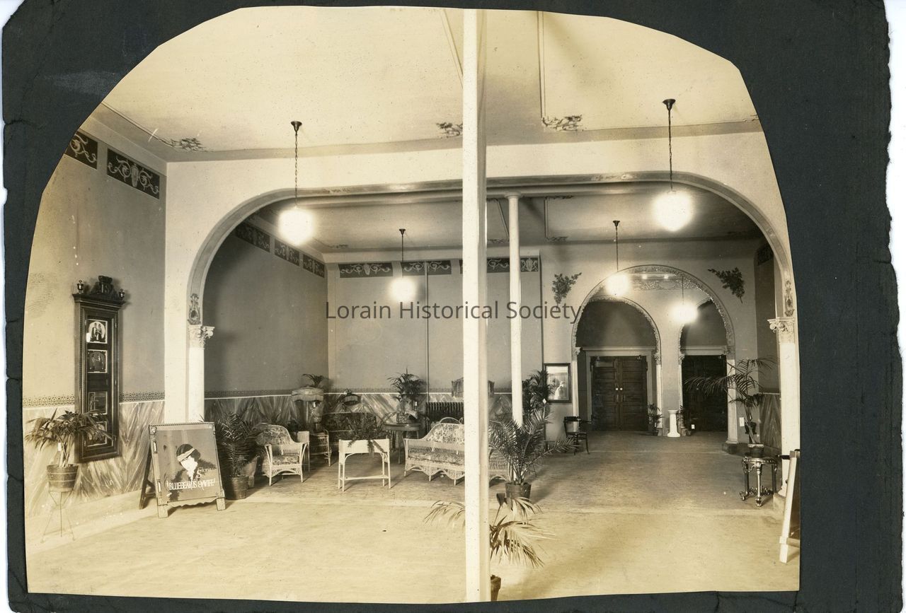 Shirley Uhse's scrapbook page with photograph of the State Theater's interior lobby and stage.