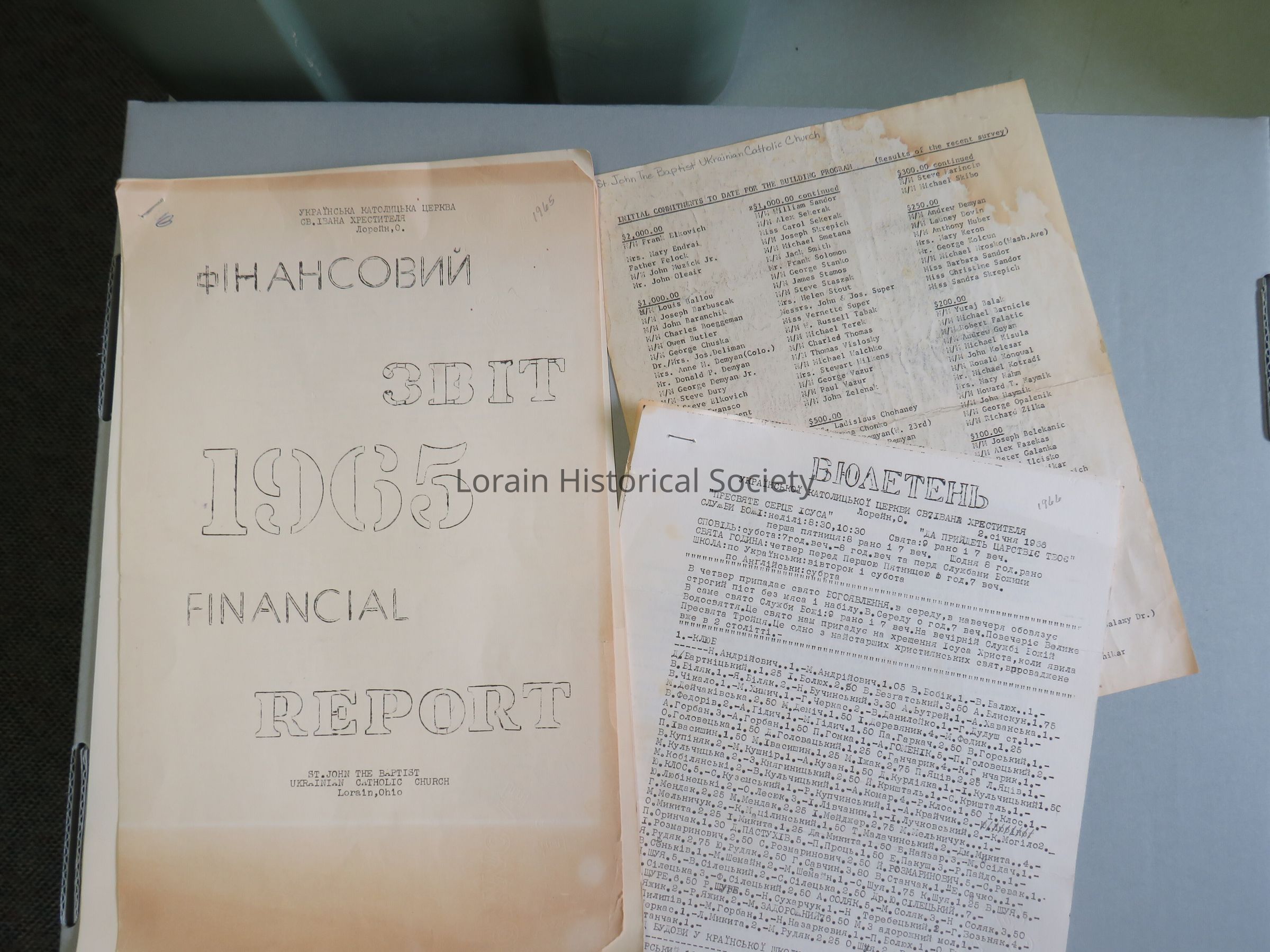 A financial report from St. John The Baptist Ukrainian Catholic Church in Lorain, Ohio from the year 1965. This includes a list of parishoners who had tithed to the church during the year and a letter in Ukrainian and English from the pastor, Fr. L. Tymkiw on the importance of supporting the parish.